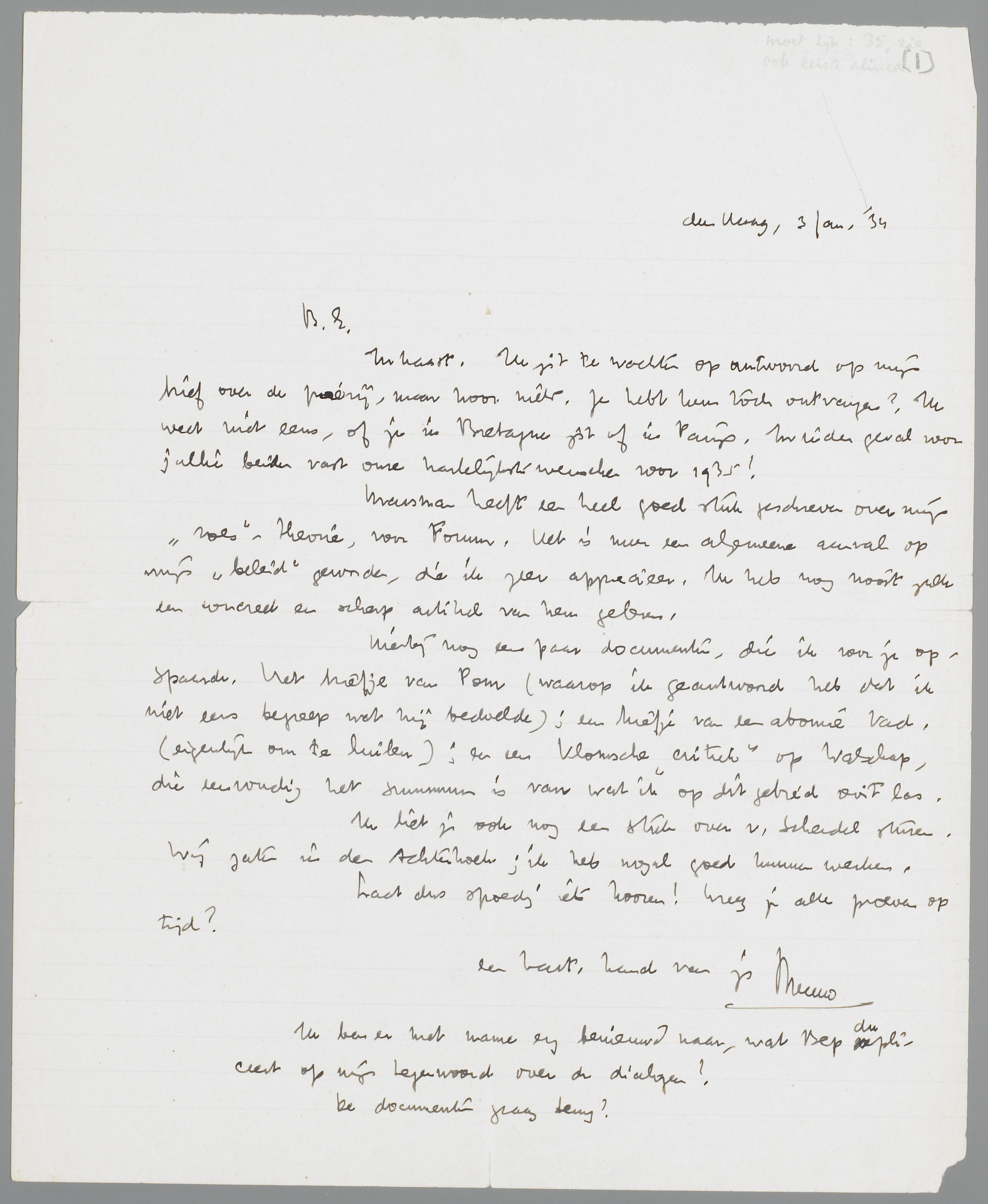 In haast. Ik zit te wachten op antwoord op mijn brief over de poëzij, maar hoor niets. Je hebt hem toch ontvangen? Ik weet niet eens, of je in Bretagne zit of in Parijs. In ieder geval voor jullie beiden vast onze hartelijke wenschen voor 1935!