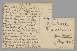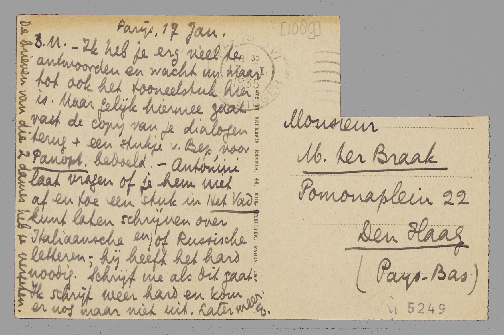 - Ik heb je erg veel te antwoorden en wacht nu maar tot ook het tooneelstuk hier is. Maar gelijk hiermee gaat vast de copy van je dialogen terug + een stukje van Bep, voor Panopt. bedoeld. - Antonini laat vragen of je hem niet af en toe een stuk in Het Vad. kunt laten schrijven over Italiaansche en/of Russische letteren, - hij heeft het hard noodig. Schrijf me als dit gaat. Ik schrijf weer hard en kom er nog maar niet uit. Later meer.