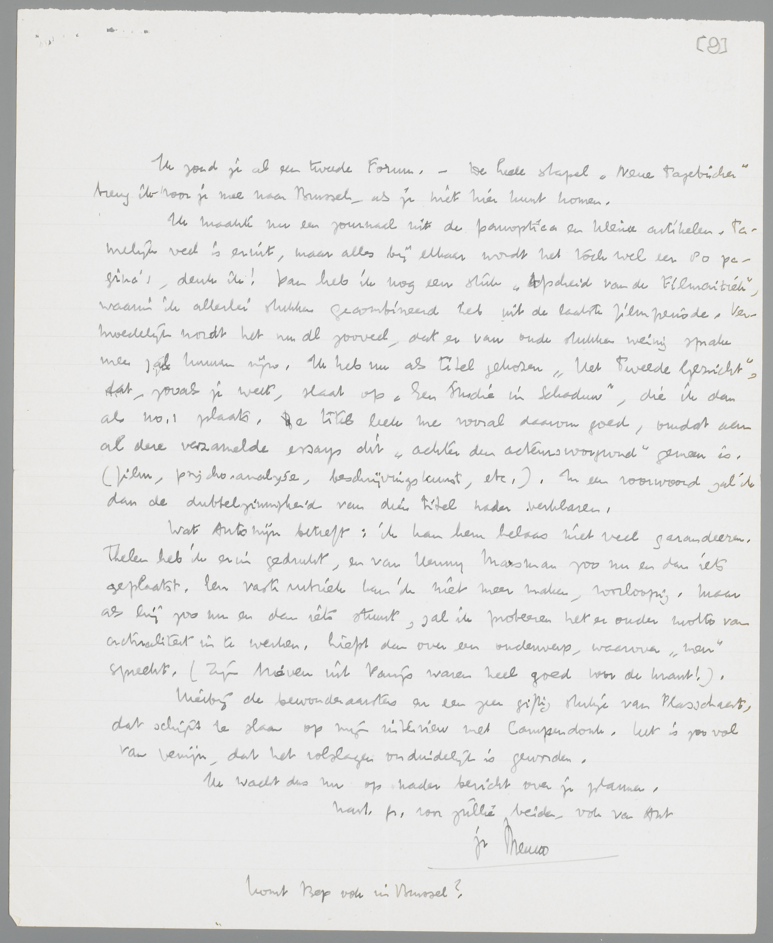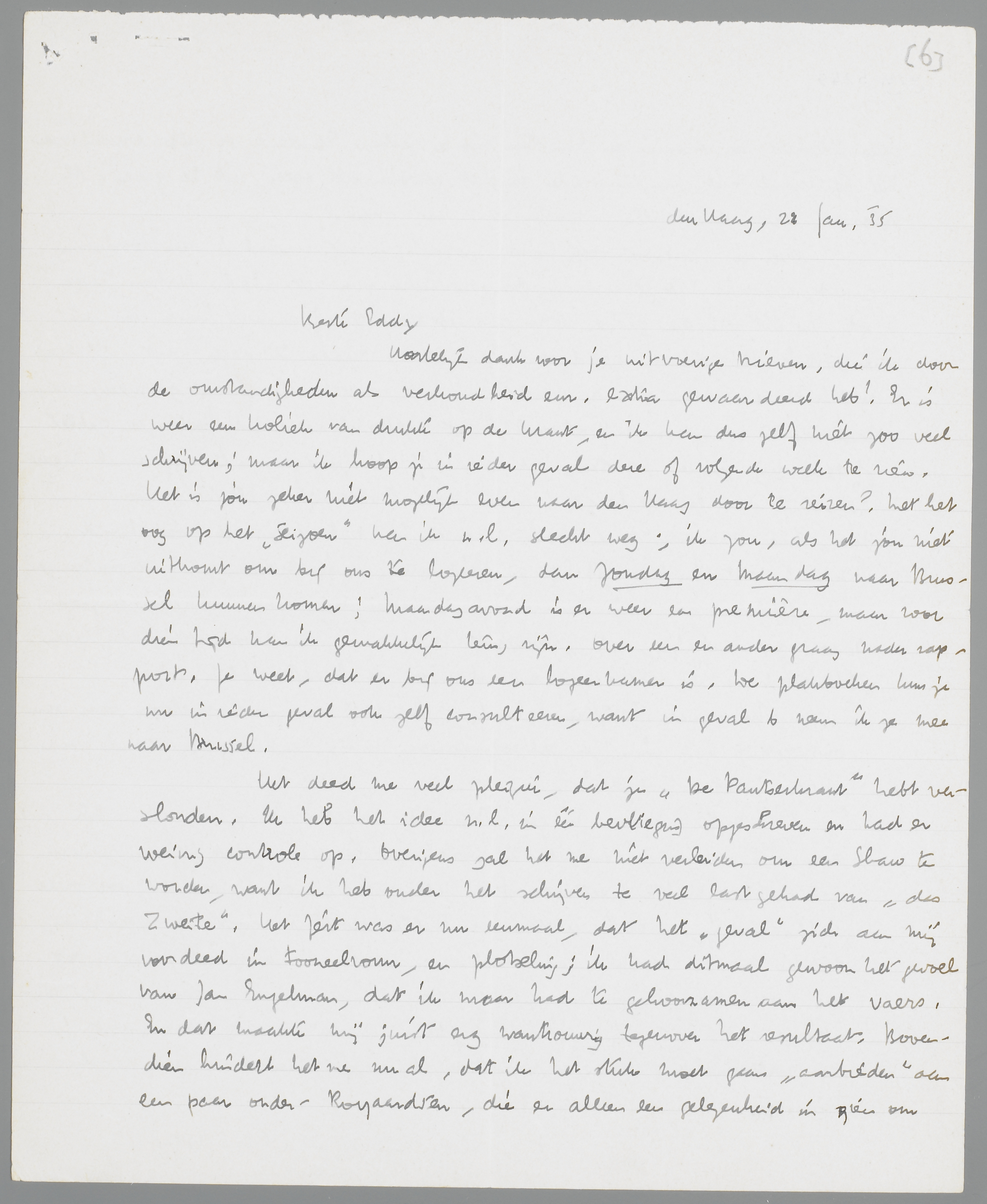 Hartelijk dank voor je uitvoerige brieven, die ik door de omstandigheden als verkoudheid enz. extra gewaardeerd heb! Er is weer een koliek van drukte op de krant, en ik kan dus zelf niet zoo veel schrijven; maar ik hoop je in ieder geval deze of volgende week te zien. Het is jou zeker niet mogelijk even naar den Haag door te reizen? Met het oog op het ‘seizoen’ kan ik n.l. slecht weg; ik zou, als het jou niet uitkomt om bij ons te logeeren, dan Zondag en Maandag naar Brussel kunnen komen; Maandagavond is er weer een première, maar voor dien tijd kan ik gemakkelijk terug zijn. Over een en ander graag nader rapport. Je weet, dat er bij ons een logeerkamer is. De plakboeken kun je nu in ieder geval ook zelf consulteeren, want in geval b neem ik ze mee naar Brussel.