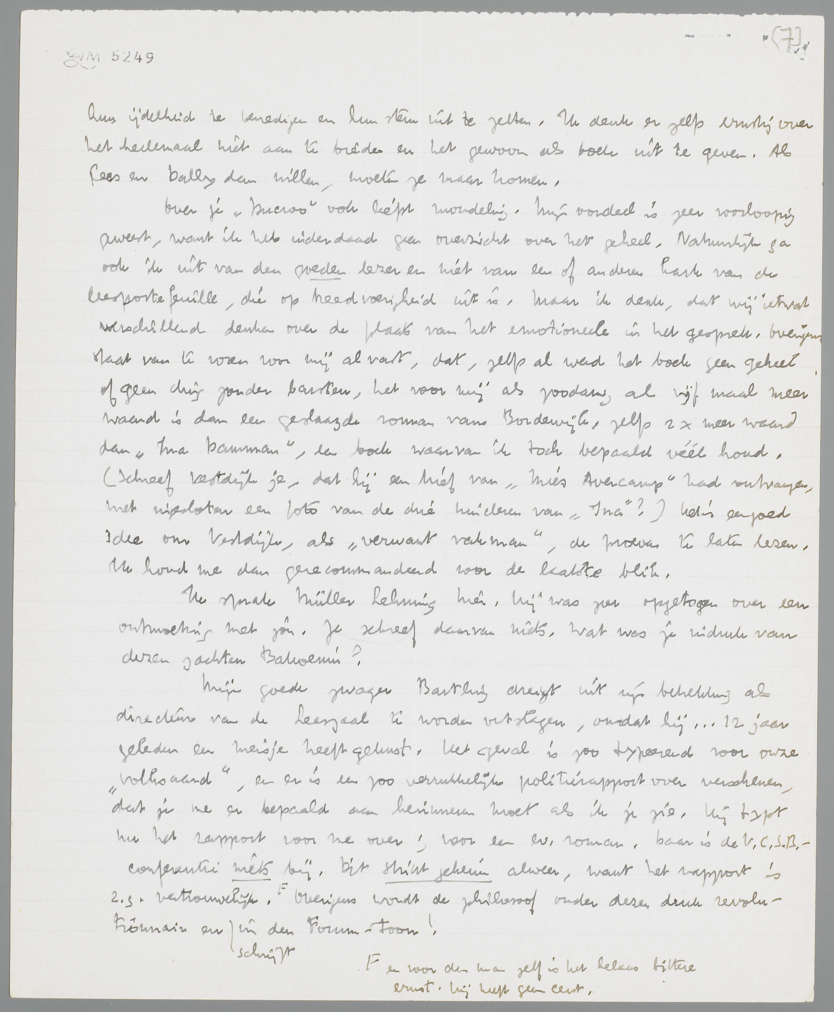 Mijn goede zwager Bartling dreigt uit zijn betrekking als directeur van de leeszaal te worden ontslagen, omdat hij ...12 jaar geleden een meisje heeft gekust. Het geval is zoo typeerend voor onze ‘volksaard’, en er is een zoo verrukkelijk politierapport over verschenen, dat je me er bepaald aan herinneren moet als ik je zie. Hij typt nu het rapport voor me over; voor een ev. roman. Daar is de V.C.S.B.-conferentie niets bij. Dit strikt geheim alweer, want het rapport is z.g. vertrouwelijk en voor den man zelf is het helaas bittere ernst. Hij heeft geen cent. Overigens wordt de philosoof onder dezen druk revolutionnair en schrijft in den Forum-toon!