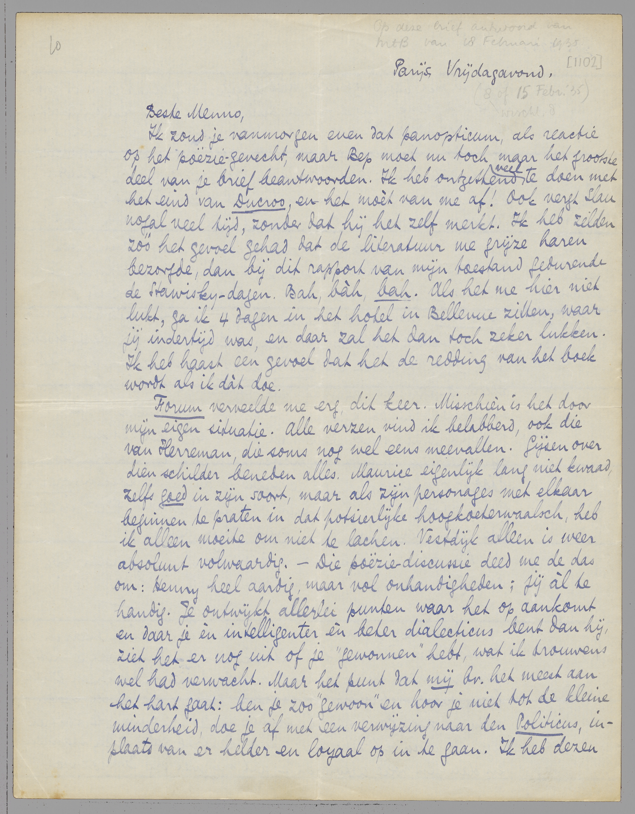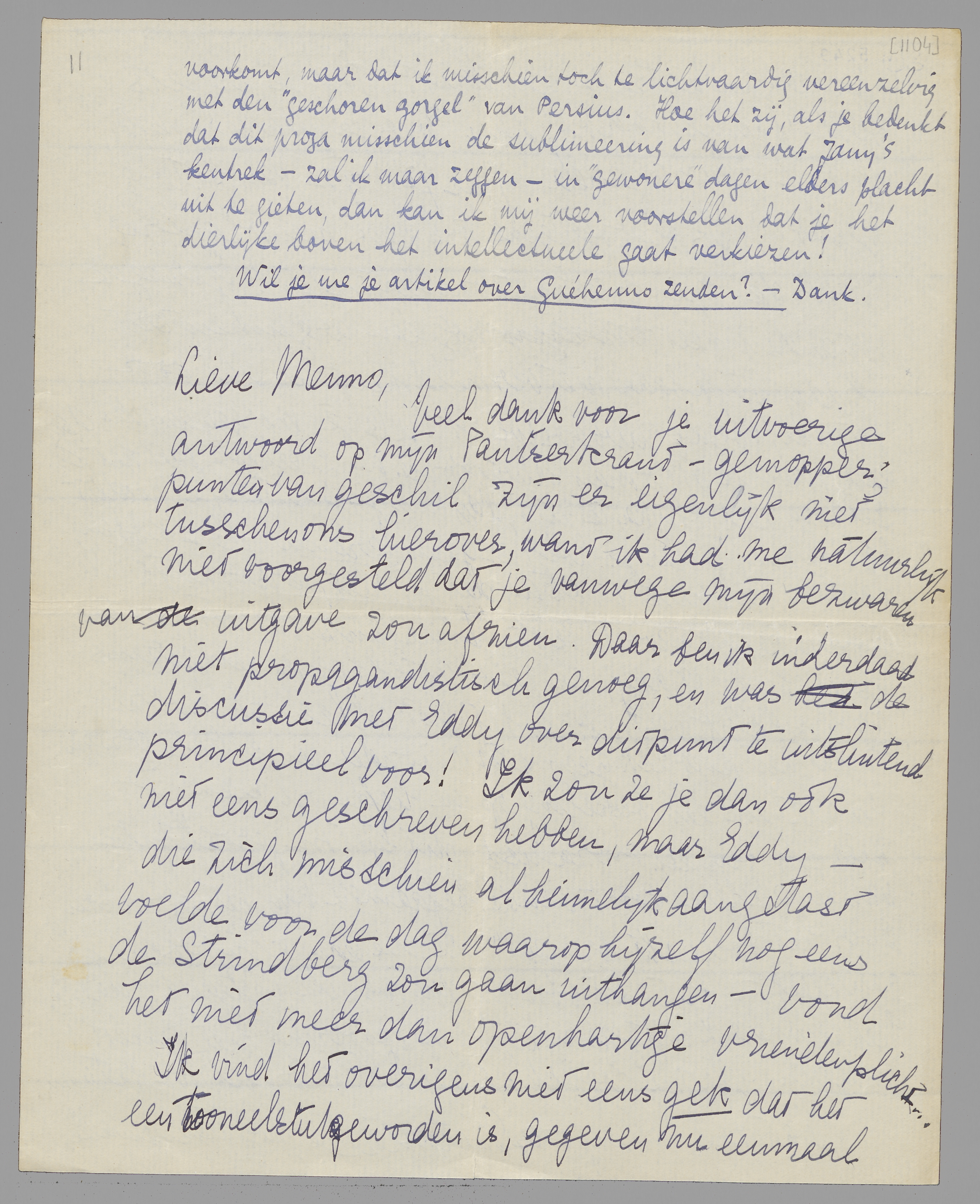 Veel dank voor je uitvoerige antwoord op mijn Pantserkrant-gemopper; punten van geschil zijn er eigenlijk niet tusschen ons hierover, want ik had me natuurlijk niet voorgesteld dat je vanwege mijn bezwaren van uitgave zou afzien. Daar ben ik inderdaad niet propagandistisch genoeg, en was de discussie met Eddy over dit punt te uitsluitend principieel voor! Ik zou je dan ook niet eens geschreven hebben, maar Eddy - die zich misschien al heimelijk aangetast voelde voor de dag waarop hijzelf nog eens de Strindberg zou gaan uithangen - vond het niet meer dan openhartige vriendenplicht...