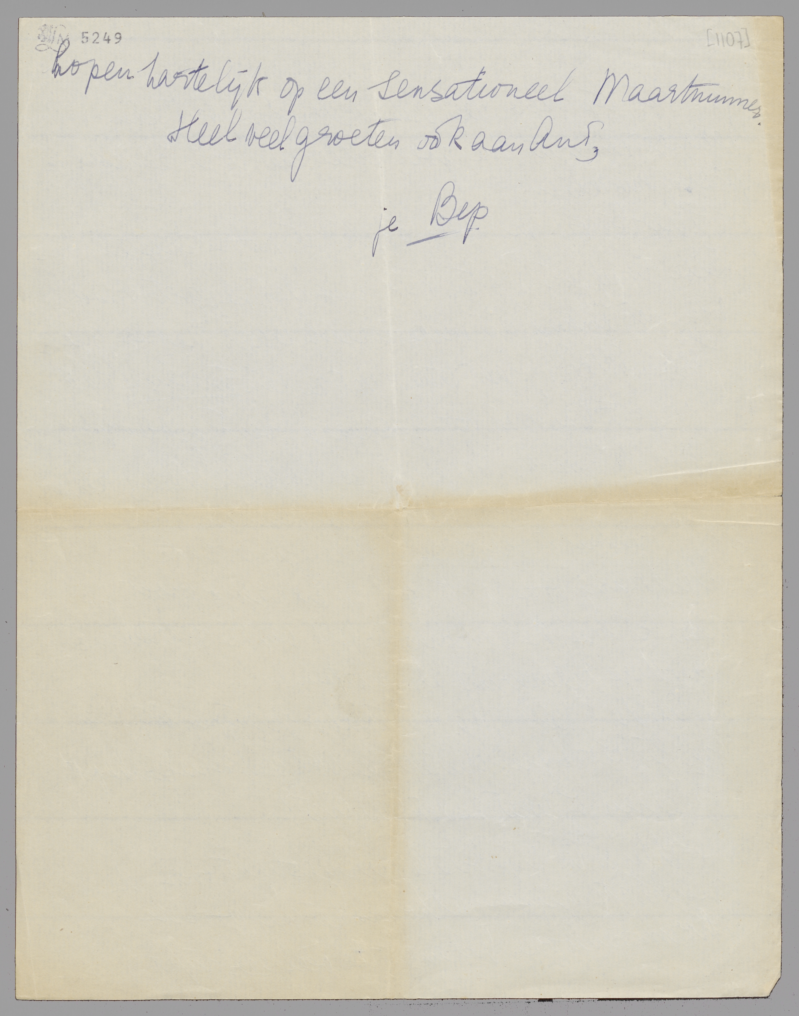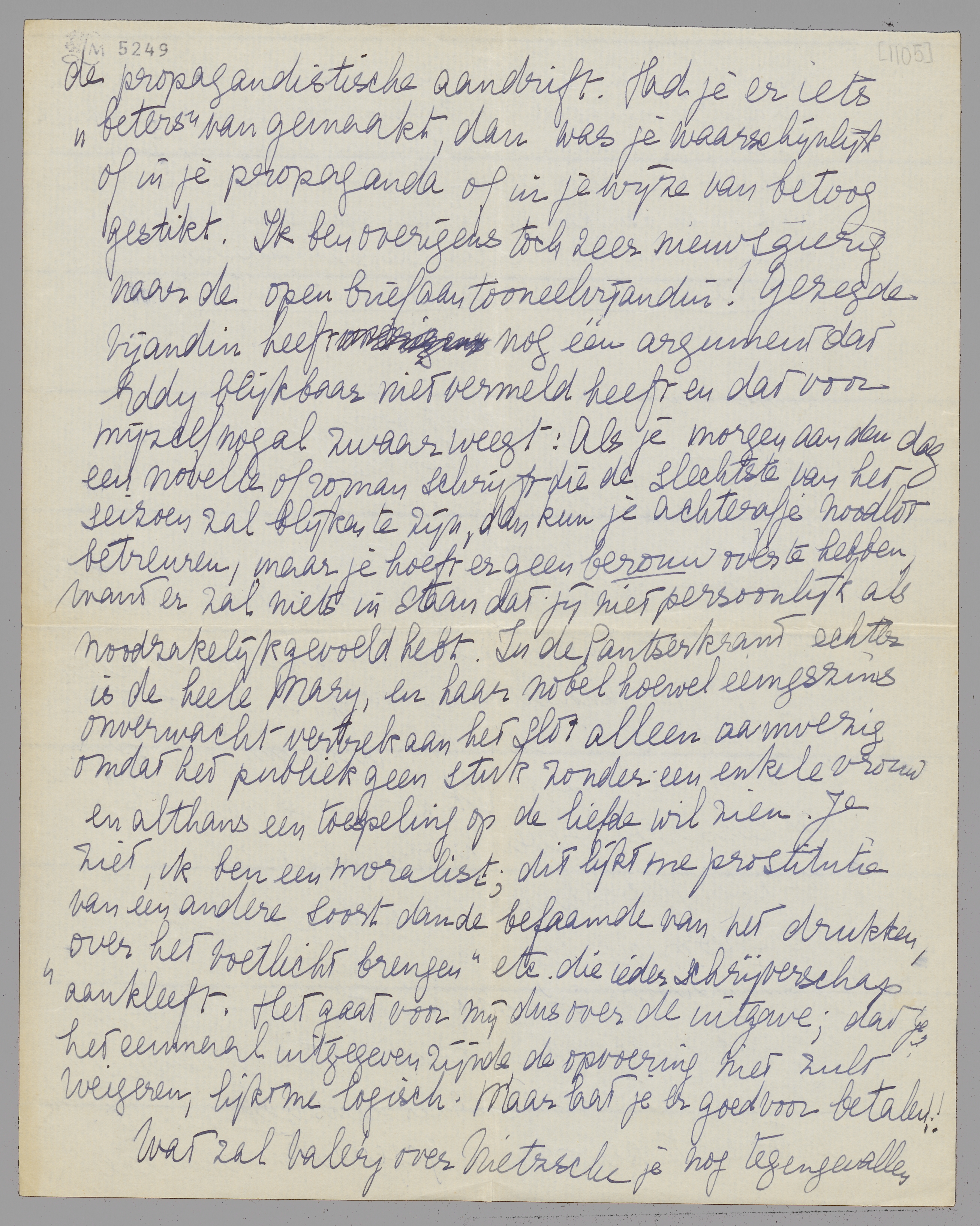 Ik vind het overigens niet eens gek dat het een tooneelstuk geworden is, gegeven nu eenmaal de propagandistische aandrift. Had je er iets ‘beters’ van gemaakt, dan was je waarschijnlijk of in je propaganda of in je wijze van betoog gestikt. Ik ben overigens toch zeer nieuwsgierig naar den open brief aan tooneel vijandin! Gezegde vijandin heeft nog een argument dat Eddy blijkbaar niet vermeld heeft en dat voor mijzelf nogal zwaar weegt: Als je morgen aan den dag een novelle of roman schrijft die de slechtste van het seizoen zal blijken te zijn, dan kun je achteraf je noodlot betreuren, maar je hoeft er geen berouw over te hebben, want er zal niets in staan dat jij niet persoonlijk als noodzakelijk gevoeld hebt. In de Pantserkrant echter is de heele Mary, en haar nobel hoewel eenigszins onverwacht vertrek aan het slot alleen aanwezig omdat het publiek geen stuk zonder een enkele vrouw en althans een toespeling op de liefde wil zien. Je ziet, ik ben een moralist; dit lijkt me prostitutie van een andere soort dan de befaamde van het drukken, ‘over het voetlicht brengen’ etc. die ieder schrijverschap aankleeft. Het gaat voor mij dus over de uitgave; dat je, het eenmaal uitgegeven zijnde de opvoering niet zult weigeren, lijkt me logisch. Maar laat je er goed voor betalen!!