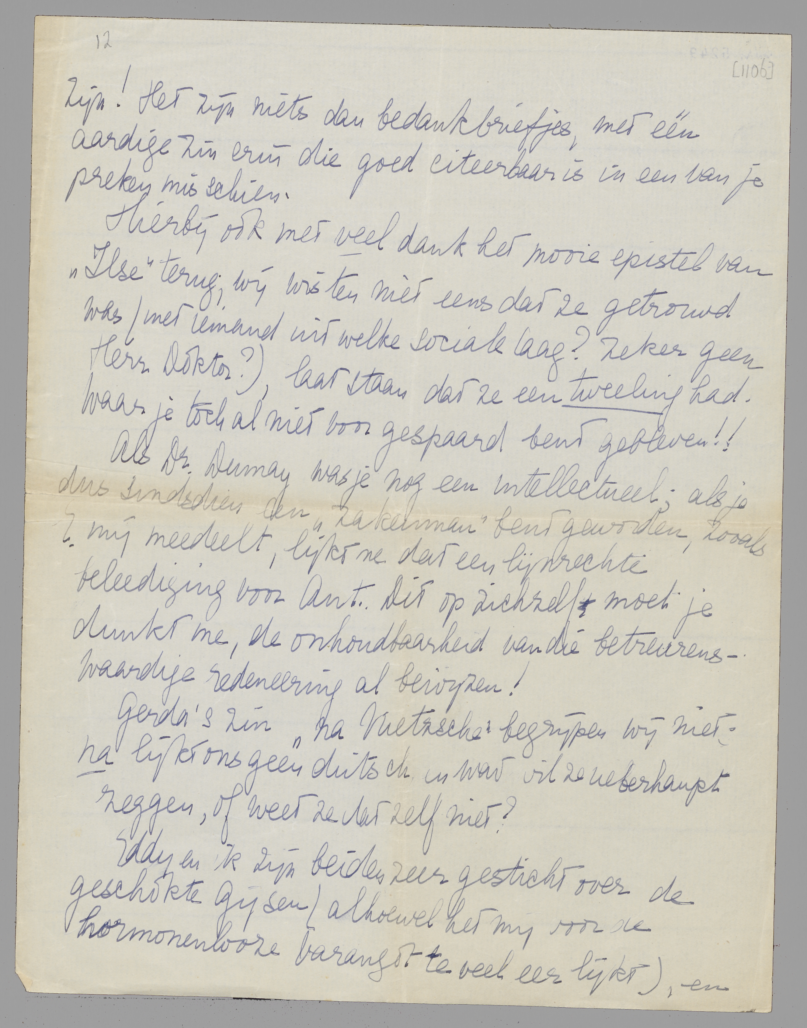 Hierbij ook met veel dank het mooie epistel van ‘Ilse’ terug, wij wisten niet eens dat ze getrouwd was (met iemand uit welke sociale laag? Zeker geen Herr Doctor?), laat staan dat ze een tweeling had. Waar je toch al niet voor gespaard bent gebleven!!
