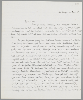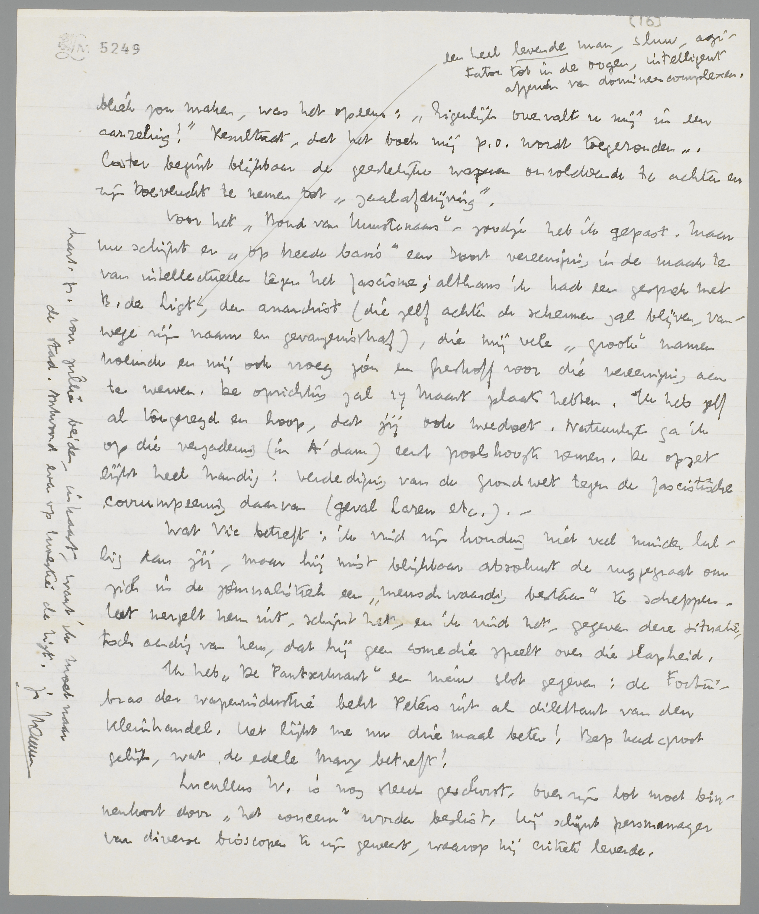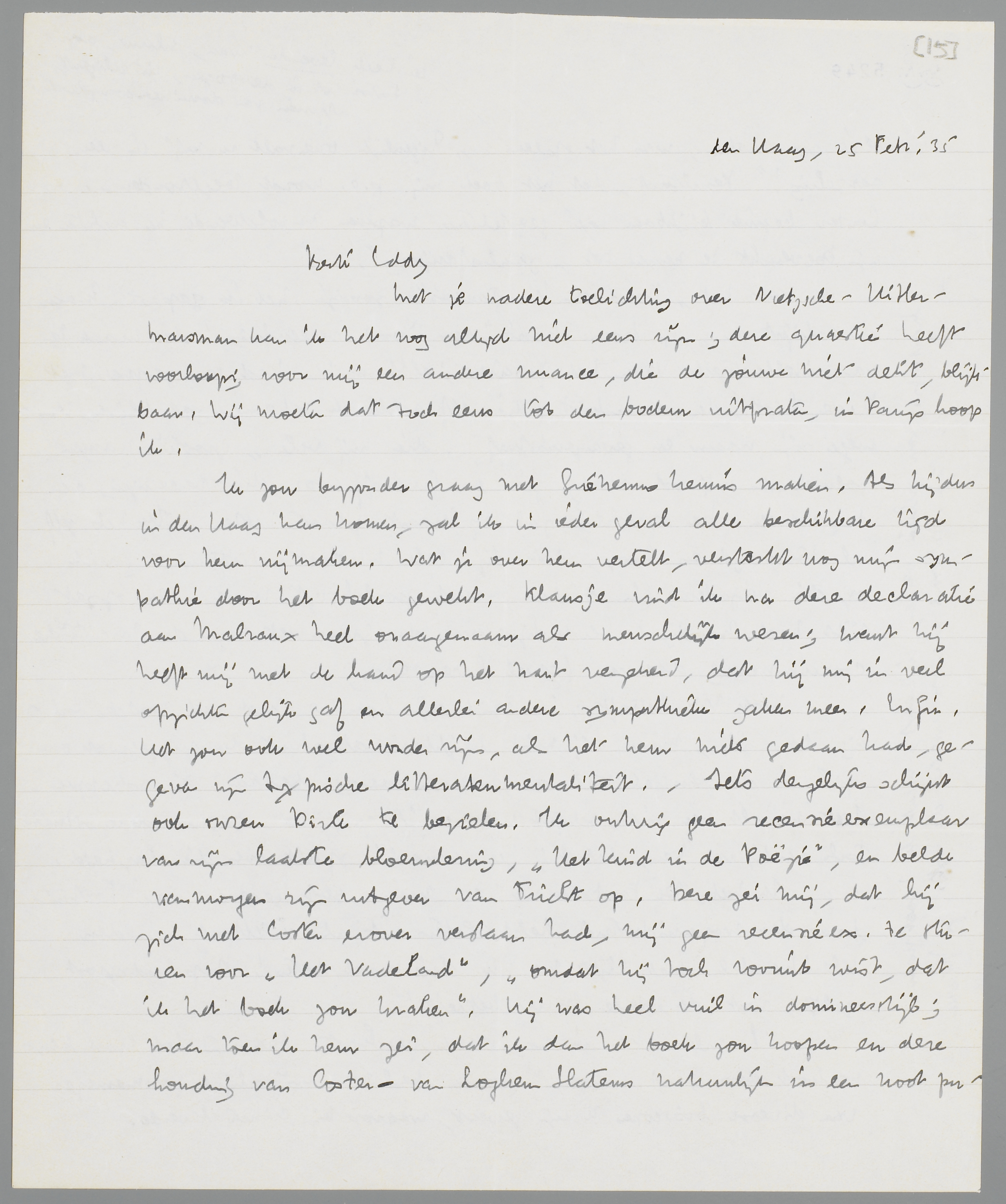 Voor het ‘Bond van Kunstenaars’-zoodje heb ik gepast. Maar nu schijnt er ‘op breede basis’ een soort vereeniging in de maak te zijn van intellectueelen tegen het fascisme; althans ik had een gesprek met B. de Ligt [een heel levende man, sluw, agitator tot in de oogen, intelligent afgezien van domineescomplexen], den anarchist (die zelf achter de schermen zal blijven, vanwege zijn naam en gevangenisstraf), die mij vele ‘groote’ namen noemde en mij ook vroeg jou en Greshoff voor die vereeniging aan te werven. De oprichting zal 17 Maart plaats hebben. Ik heb zelf al toegezegd en hoop, dat jij ook meedoet. Natuurlijk ga ik op die vergadering (in A'dam) eerst poolshoogte nemen. De opzet lijkt heel handig: verdediging van de grondwet tegen de fascistische corrumpeering daarvan (geval Laren etc.).