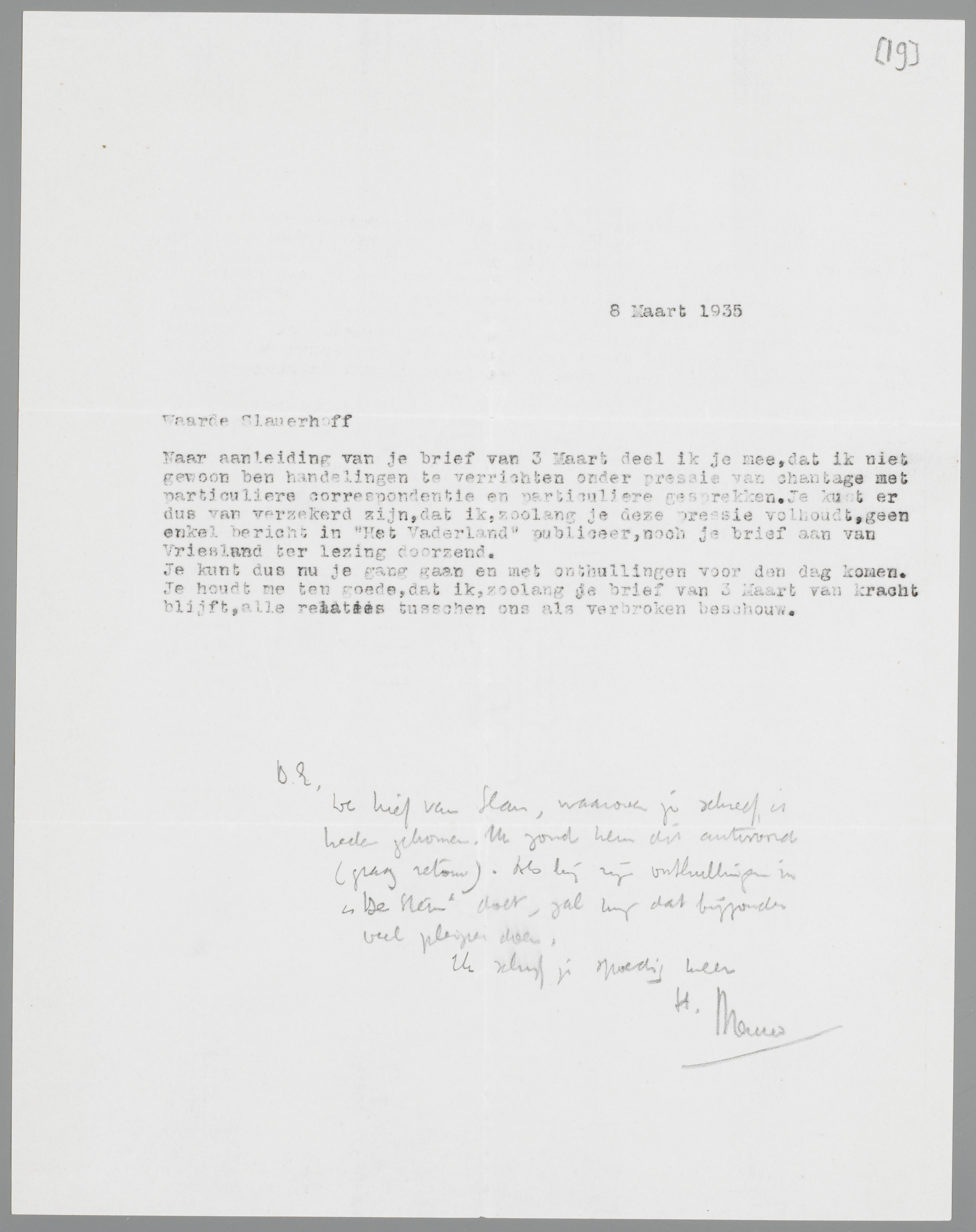 De brief van Slau, waarover je schreef, is heden gekomen. Ik zond hem dit antwoord (graag retour). Als hij zijn onthullingen in De Stem doet zal mij dat bijzonder veel pleizier doen.