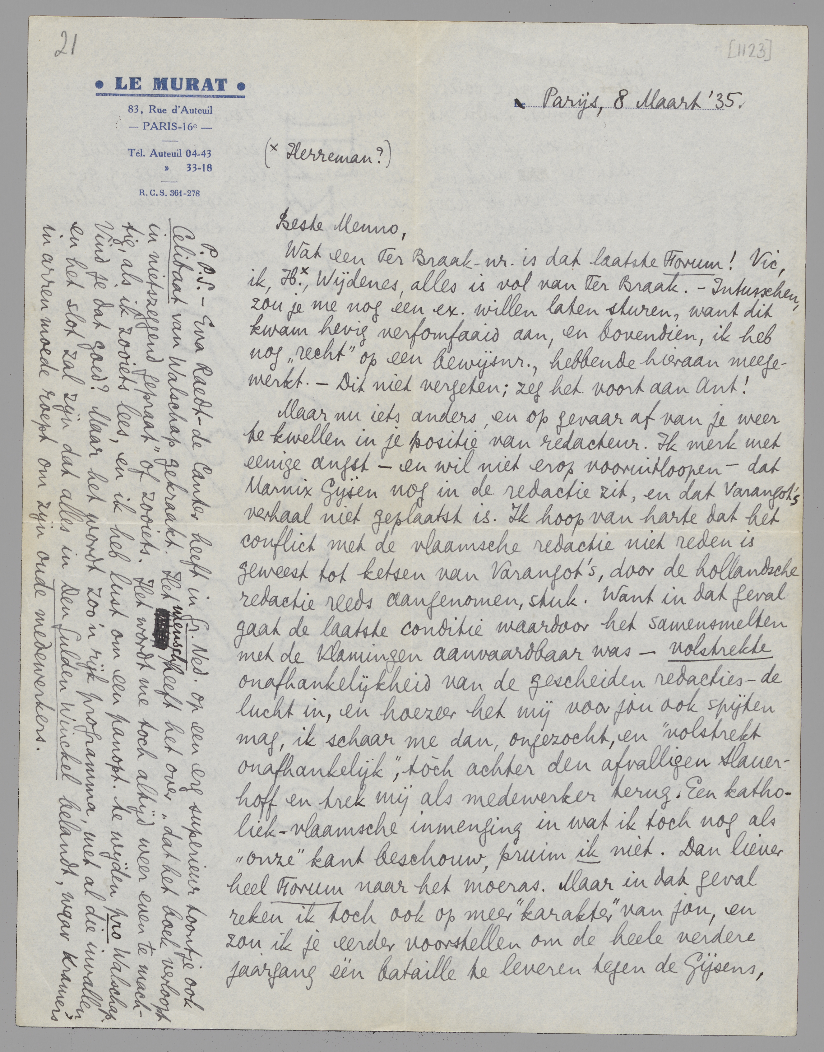 Wat een Ter Braak-nr. is dat laatste Forum! Vic, ik, H. [Herreman?], Wijdenes, alles is vol van Ter Braak. - Intusschen, zou je me nog een ex. willen laten sturen, want dit kwam hevig verfomfaaid aan, en bovendien, ik heb nog ‘recht’ op een bewijsnr., hebbende hieraan meegewerkt. - Dit niet vergeten; zeg het voort aan Ant!