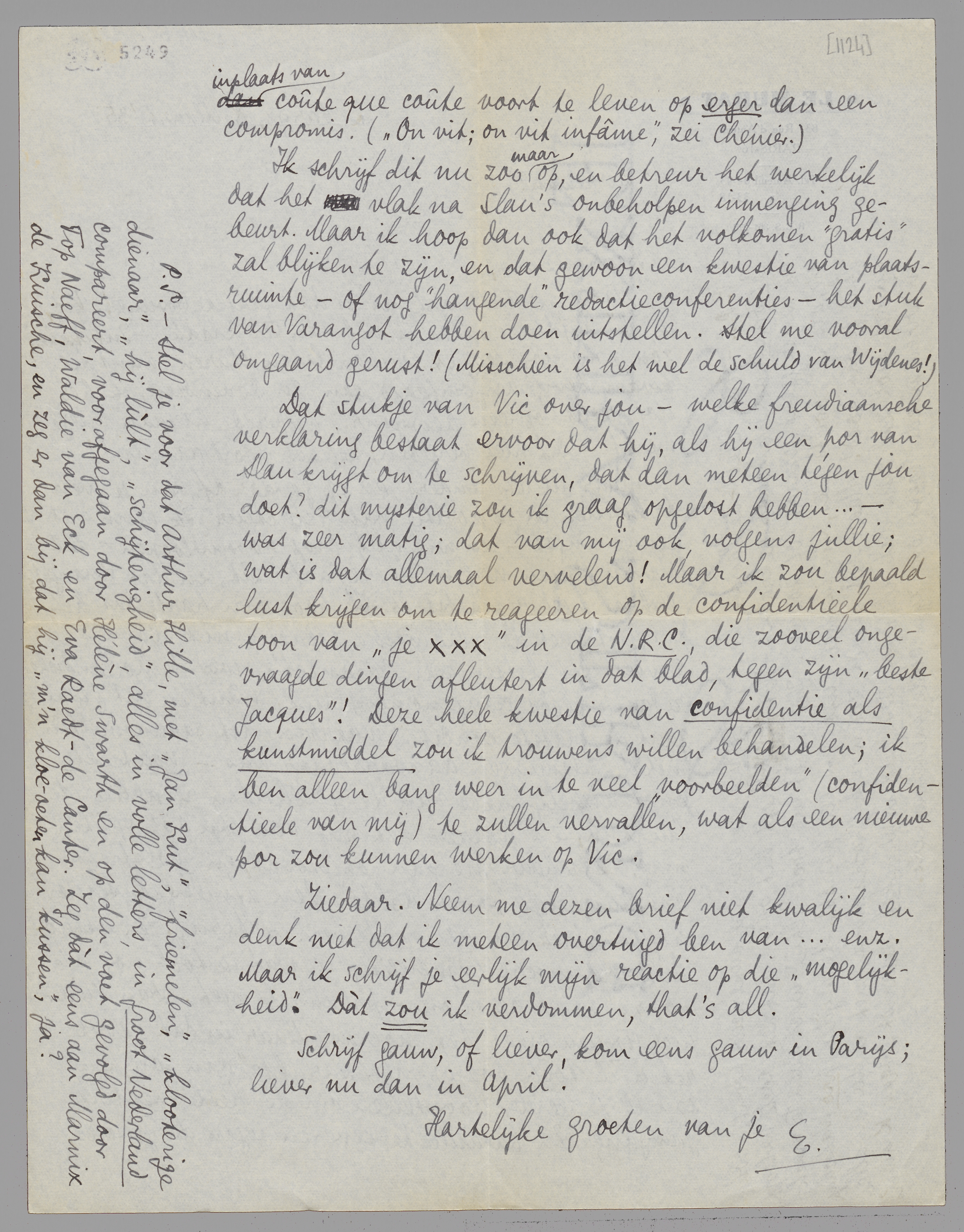 Dat stukje van Vic over jou - welke freudiaansche verklaring bestaat ervoor dat hij, als hij een por van Slau krijgt om te schrijven, dat dan meteen tègen jou doet? dit mysterie zou ik graag opgelost hebben... - was zeer matig; dat van mij ook, volgens jullie; wat is dat allemaal vervelend! Maar ik zou bepaald lust krijgen om te reageeren op de confidentieele toon van ‘je XXX’ in de N.R.C., die zooveel ongevraagde dingen afleutert in dat blad, tegen zijn ‘beste Jacques’! Deze heele kwestie van confidentie als kunstmiddel zou ik trouwens willen behandelen; ik ben alleen bang weer in te veel ‘voorbeelden’ (confidentieele van mij) te zullen vervallen, wat als een nieuwe por zou kunnen werken op Vic.