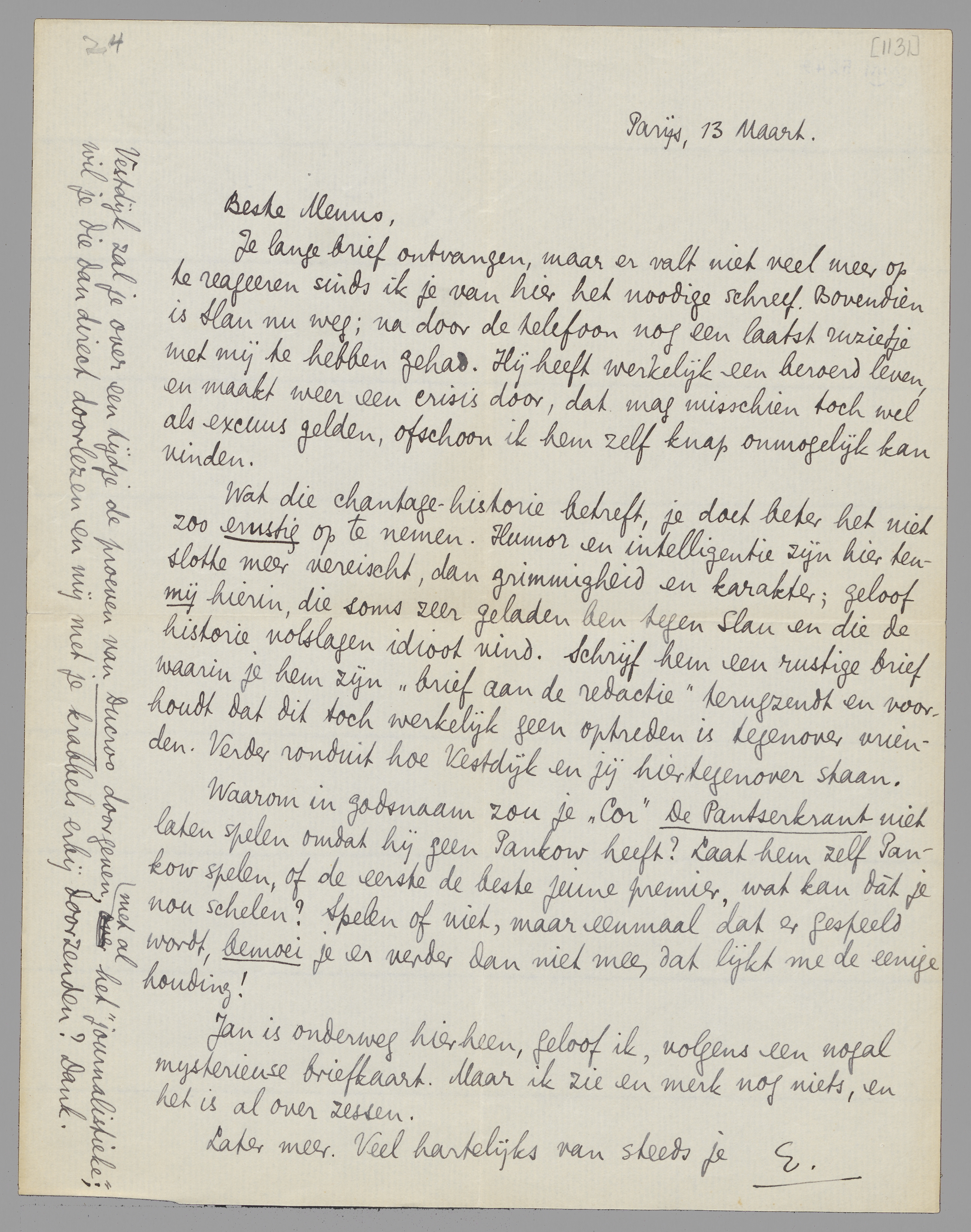 Wat die chantage-historie betreft, je doet beter het niet zoo ernstig op te nemen. Humor en intelligentie zijn hier tenslotte meer vereischt, dan grimmigheid en karakter; geloof mij hierin, die soms zeer geladen ben tegen Slau en die de historie volslagen idioot vind. Schrijf hem een rustige brief waarin je hem zijn ‘brief aan de redactie’ terugzendt en voorhoudt dat dit toch werkelijk geen optreden is tegenover vrienden. Verder ronduit hoe Vestdijk en jij hier tegenover staan.