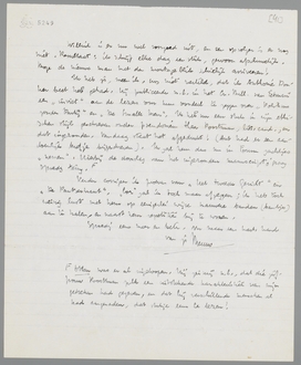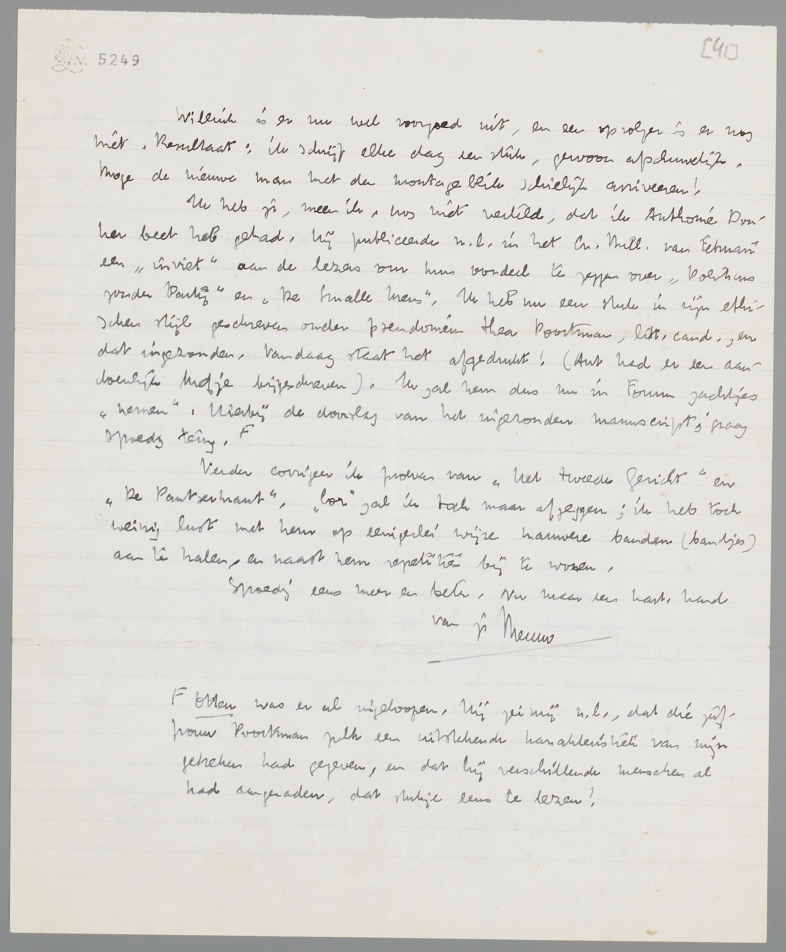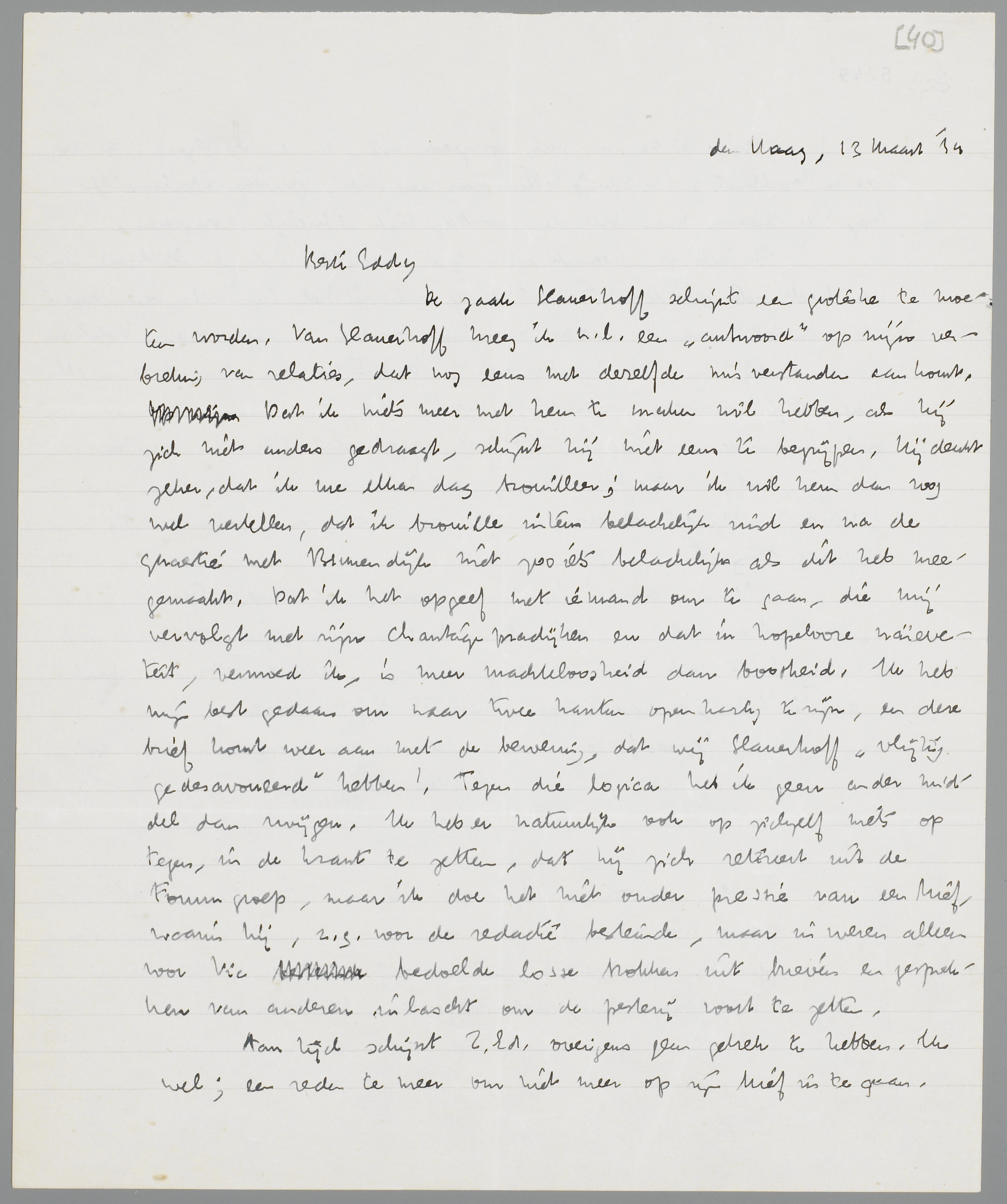 Ik heb je, meen ik, nog niet verteld, dat ik Anthonie Donker beet heb gehad. Hij publiceerde n.l. in het Cr. Bull. van Februari een ‘inviet’ aan de lezers om hun oordeel te zeggen over Politicus zonder Partij en De Smalle Mens. Ik heb nu een stuk in zijn ethischen stijl geschreven onder pseudoniem Thea Poortman, litt. cand., en dat ingezonden. Vandaag staat het afgedrukt! (Ant had er een aandoenlijk briefje bijgeschreven). Ik zal hem dus nu in Forum zachtjes ‘nemen’. Hierbij de doorslag van het ingezonden manuscript, graag spoedig terug. [Otten was er al ingeloopen. Hij zei mij n.l., dat die juffrouw Poortman zulk een uitstekende karakteristiek van mijn gebreken had gegeven, en dat hij verschillende menschen al had aangeraden, dat stukje eens te lezen!]