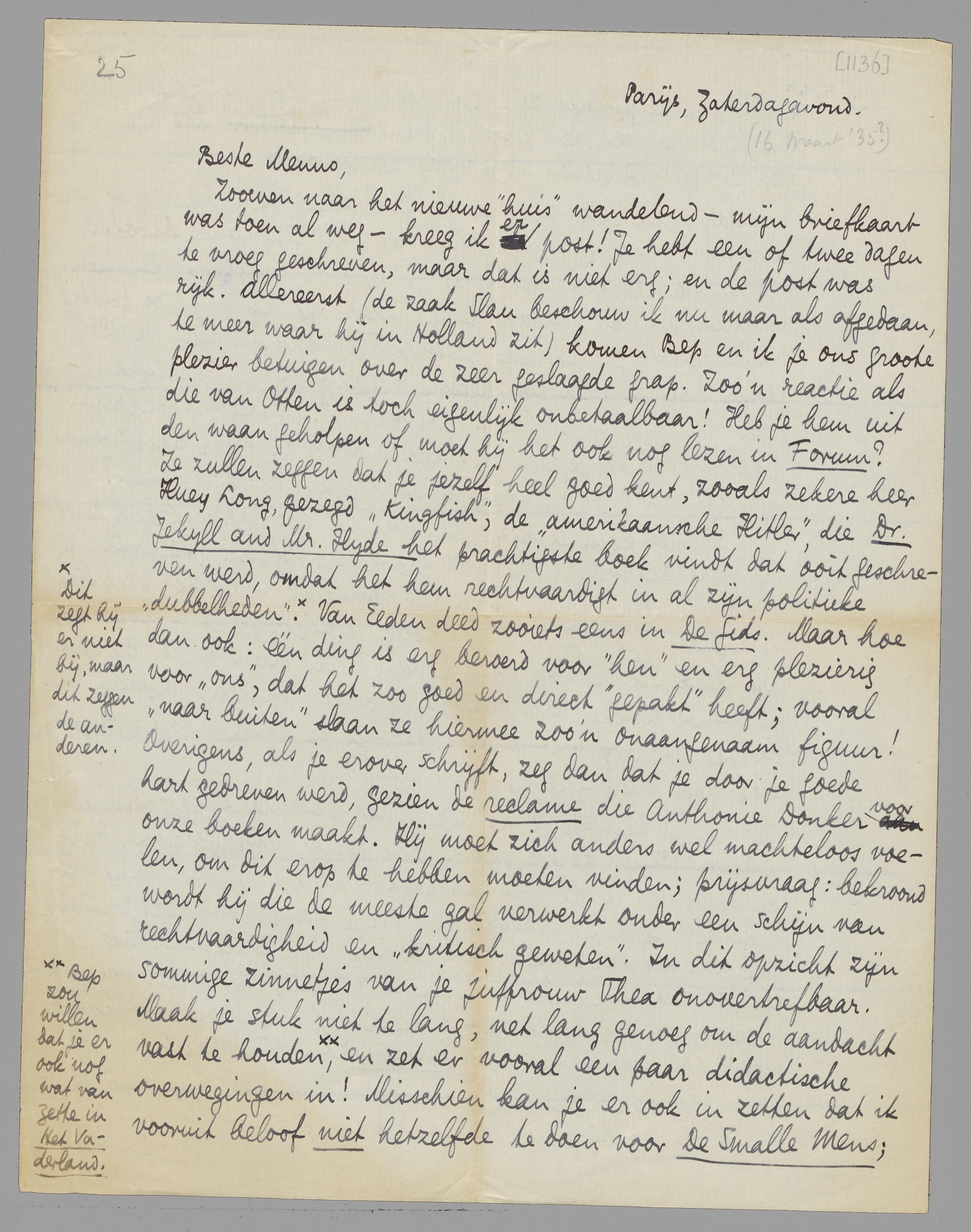 Zooeven naar het nieuwe ‘huis’ wandelend - mijn briefkaart was toen al weg - kreeg ik er post! Je hebt een of twee dagen te vroeg geschreven, maar dat is niet erg; en de post was rijk. Allereerst (de zaak Slau beschouw ik nu maar als afgedaan, te meer waar hij in Holland zit) komen Bep en ik je ons groote plezier betuigen over de zeer geslaagde grap. Zoo'n reactie als die van Otten is toch eigenlijk onbetaalbaar! Heb je hem uit den waan geholpen of moet hij het ook nog lezen in Forum? Ze zullen zeggen dat je jezelf heel goed kent, zooals zekere heer Huey Long, gezegd ‘Kingfish’, de ‘amerikaansche Hitler’, die Dr. Jekyll and Mr. Hyde het prachtigste boek vindt dat ooit geschreven werd, omdat het hem rechtvaardigt in al zijn politieke ‘dubbelheden’. [Dit zegt hij er niet bij, maar dit zeggen de anderen.] Van Eeden deed zooiets eens in De Gids. Maar hoe dan ook: één ding is erg beroerd voor ‘hen’ en erg plezierig voor ‘ons’, dat het zoo goed en direct ‘gepakt’ heeft; vooral ‘naar buiten’ slaan ze hiermee zoo'n onaangenaam figuur! Overigens, als je er over schrijft, zeg dan dat je door je goede hart gedreven werd, gezien de reclame die Anthonie Donker voor onze boeken maakt. Hij moet zich anders wel machteloos voelen, om dit erop te hebben moeten vinden; prijsvraag: bekroond wordt hij die de meeste gal verwerkt onder een schijn van rechtvaardigheid en ‘kritisch geweten’. In dit opzicht zijn sommige zinnetjes van je juffrouw Thea onovertrefbaar. Maak je stuk niet te lang, net lang genoeg om de aandacht vast te houden, [Bep zou willen dat je er ook nog wat van zette in Het Vaderland] en zet er vooral een paar didactische overwegingen in! Misschien kan je er ook in zetten dat ik vooruit beloof niet hetzelfde te doen voor De Smalle Mens; eerder zou ik geneigd zijn een boekwerk (door mijzelf te bepalen) te sturen aan den inzender van de bespreking die het meest aan bovenomschreven prijsvraag beantwoordt.