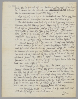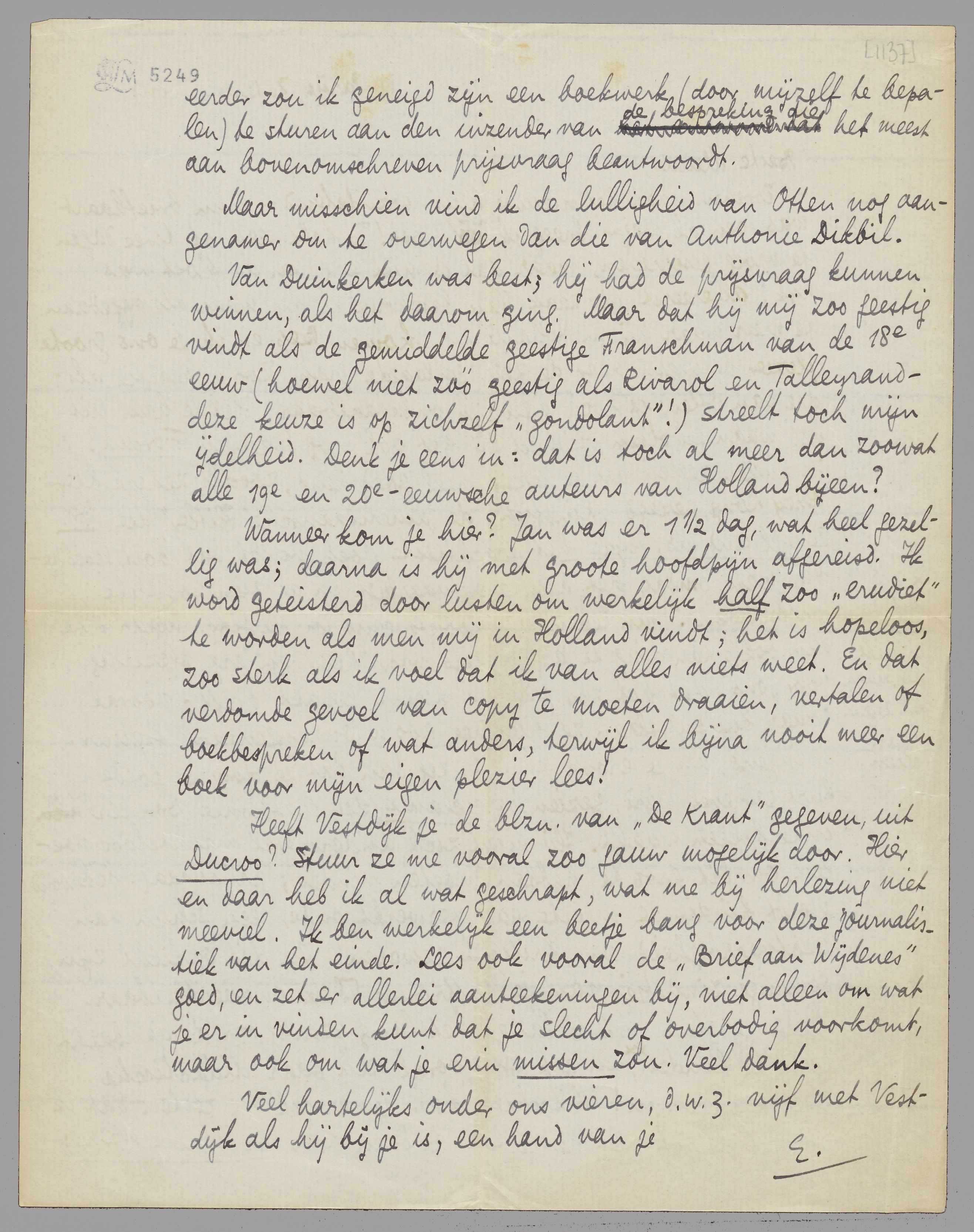 Heeft Vestdijk je de blzn. van ‘De Krant’ gegeven, uit Ducroo? Stuur ze me vooral zoo gauw mogelijk door. Hier en daar heb ik al wat geschrapt, wat me bij herlezing niet meeviel. Ik ben werkelijk een beetje bang voor deze journalistiek van het einde. Lees ook vooral de ‘Brief aan Wijdenes’ goed, en zet er allerlei aanteekeningen bij, niet alleen om wat je er in vinden kunt dat je slecht of overbodig voorkomt, maar ook om wat je erin missen zou. Veel dank.