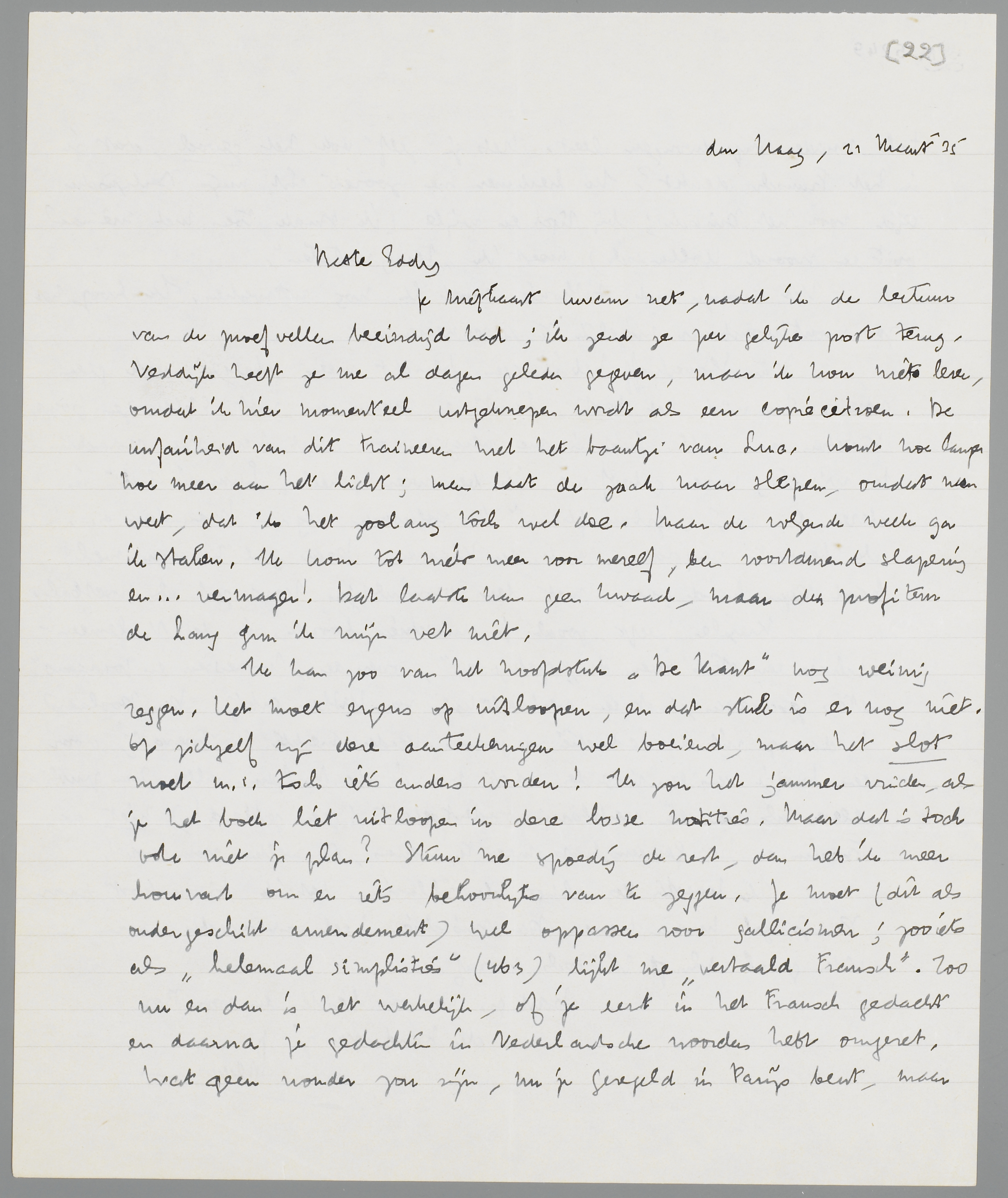 Ik kan zoo van het hoofdstuk De Krant nog weinig zeggen. Het moet ergens op uitloopen, en dat stuk is er nog niet. Op zichzelf zijn deze aanteekeningen wel boeiend, maar het slot moet m.i. toch iets anders worden! Ik zou het jammer vinden, als je het toch liet uitloopen in deze losse notities. Maar dat is toch ook niet je plan? Stuur me spoedig de rest, dan heb ik meer houvast om er iets persoonlijks van te zeggen. Je moet (dit als ondergeschikt amendement) wel oppassen voor gallicismen; zooiets als ‘helemaal simplisties’ (463) lijkt me vertaald ‘Fransch’. Zoo nu en dan is het werkelijk, of je eerst in het Fransch gedacht en daarna je gedachten in Nederlandsche woorden hebt omgezet. Wat geen wonder zou zijn, nu je geregeld in Parijs bent, maar toch minder ongedwongen leest. Heb je zelf ook het gevoel, dat je in het Fransch denkt? Ik herinner me zooiets uit mijn Berlijnsche tijd voor het Duitsch; bij tijd en wijle (ik sprak toen met niemand ooit een woord Hollandsch) moest ik ‘terug vertalen’.