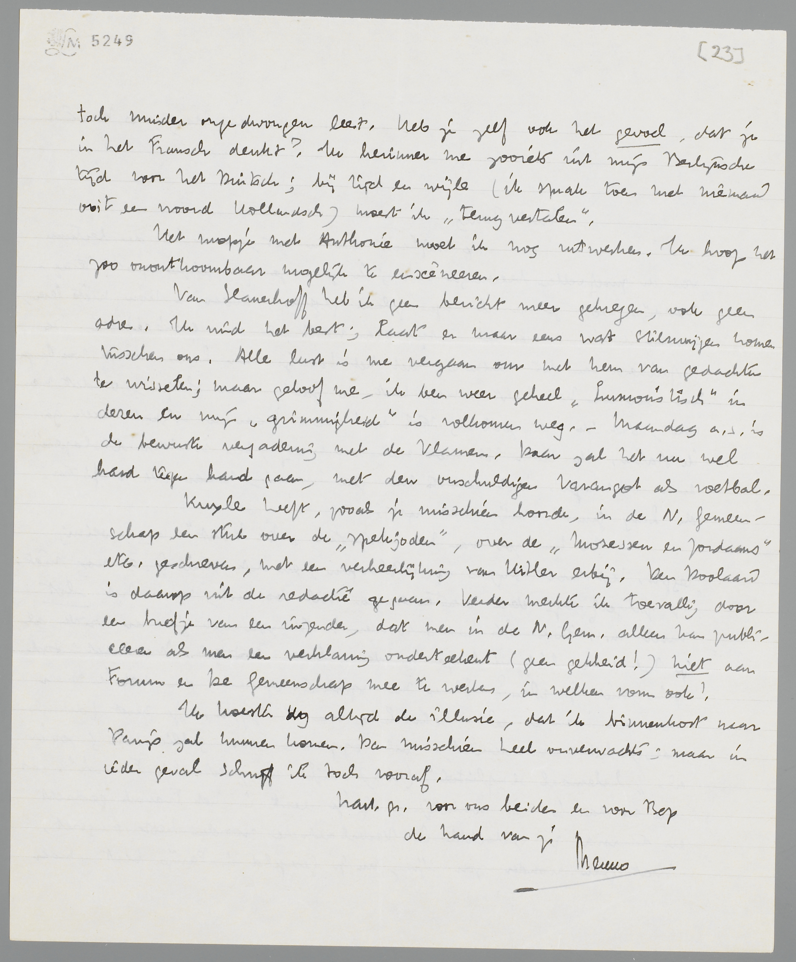 Kuyle heeft, zooals je misschien hoorde, in de N. Gemeenschap een stuk over de ‘spekjoden’, over de ‘Mozessen en Jordaans’ etc. geschreven, met een verheerlijking van Hitler erbij. Den Doolaard is daarop uit de redactie gegaan. Verder merkte ik toevallig door een briefje van een inzender, dat men in de N. Gem. alleen kan publiceeren als men een verklaring onderteekent (geen gekheid!) niet aan Forum en de Gemeenschap mee te werken, in welken vorm ook!