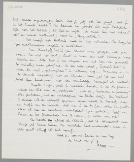 Je briefkaart kwam net, nadat ik de lectuur van de proefvellen beëindigd had; ik zend ze per gelijke post terug. Vestdijk heeft ze me al dagen geleden gegeven, maar ik kon niets lezen, omdat ik hier momenteel uitgeknepen wordt als een copiecitroen. De unfairheid van dit traineeren met het baantje van Luc, komt hoe langer hoe meer aan het licht; men laat de zaak maar slepen, omdat men weet, dat ik het zoolang toch wel doe. Maar de volgende week ga ik staken. Ik kom tot niets meer voor mezelf, ben voortdurend slaperig en... vermager! Dat laatste kan geen kwaad, maar den profiteur de Lang gun ik mijn vet niet.