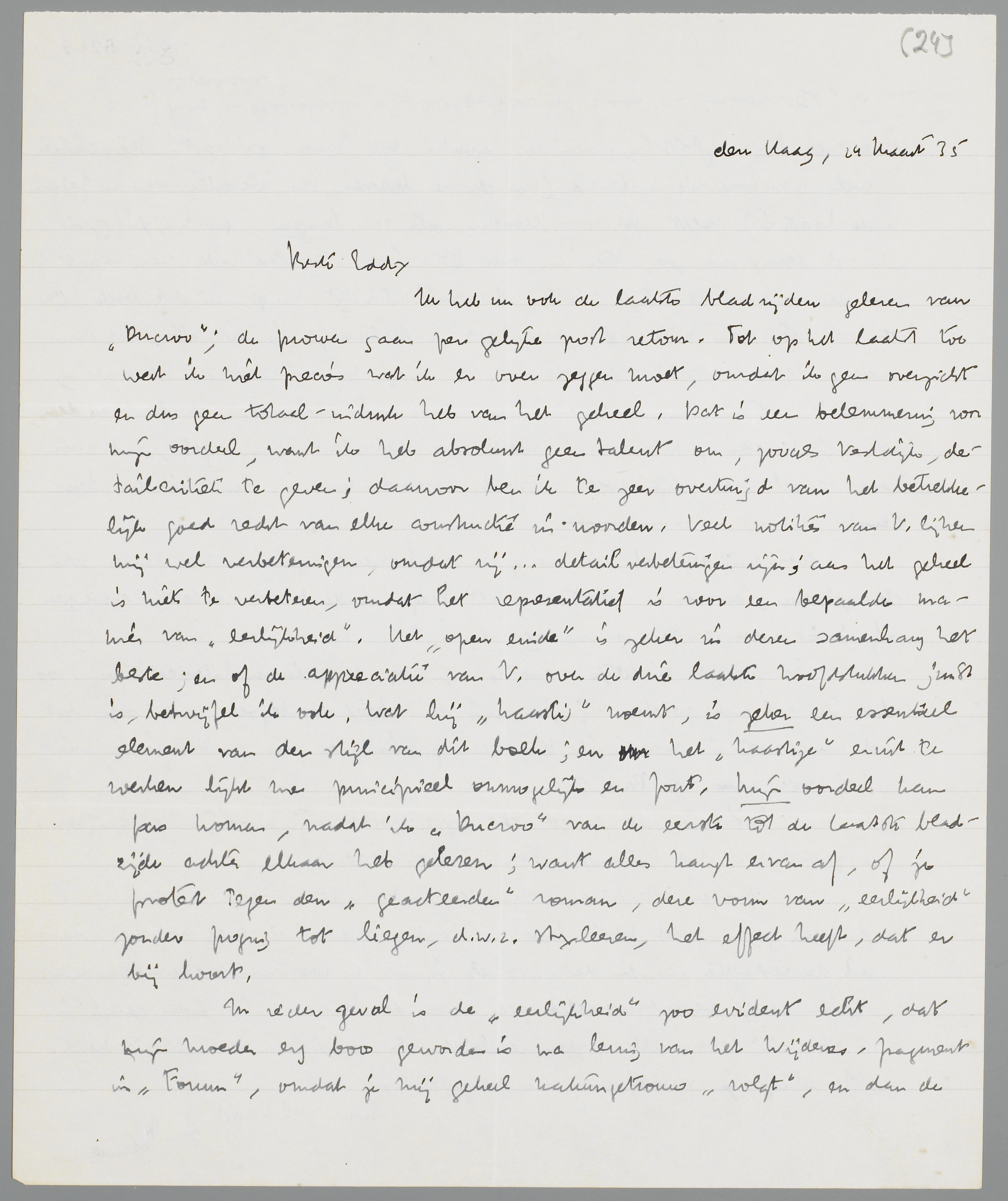 Ik heb nu ook de laatste bladzijden gelezen van Ducroo; de proeven gaan per gelijke post retour. Tot op het laatst toe weet ik niet precies wat ik er over zeggen moet, omdat ik geen overzicht en dus geen totaal-indruk heb van het geheel. Dat is een belemmering voor mijn oordeel, want ik heb absoluut geen talent om, zooals Vestdijk, detailcritiek te geven; daarvoor ben ik te zeer overtuigd van het betrekkelijk goed recht van elke constructie in woorden. Veel notities van V. lijken mij wel verbeteringen, omdat zij... detailverbeteringen zijn; aan het geheel is niets te verbeteren, omdat het representatief is voor een bepaalde manier van ‘eerlijkheid’. Het ‘open einde’ is zeker in dezen samenhang het beste; en of de appreciatie van V. over de drie laatste hoofdstukken juist is, betwijfel ik ook. Wat hij ‘haastig’ noemt, is zeker een essentieel element van den stijl van dit boek; en het ‘haastige’ eruit te werken lijkt me principieel onmogelijk en fout. Mijn oordeel kan pas komen, nadat ik Ducroo van de eerste tot de laatste bladzijde achter elkaar heb gelezen; want alles hangt er van af, of je protest tegen den ‘geacteerden’ roman, deze vorm van ‘eerlijkheid’ zonder poging tot liegen, d.w.z. styleeren, het effect heeft, dat er bij hoort.