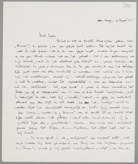 In ieder geval is de ‘eerlijkheid’ zoo evident echt, dat mijn moeder erg boos geworden is na lezing van het Wijdenes-fragment in Forum, omdat je mij geheel natuurgetrouw ‘volgt’, en dan de scene met Otje plotseling aan de familie van Emden ontleent. Die reactie is wel merkwaardig: iemand (een gewone lezeres, die toevallig van de feiten op de hoogte is) voelt dit onwillekeurig als een leugen, en mijzelf ging het ook eenigszins zoo, toen ik over Otje las. De methode verdraagt zulk een inlasch eigenlijk niet, de authenticiteit krijgt in dit boek bijna het karakter van historische ‘waarheid’. Natuurlijk is dit iets, dat den anderen lezer ontgaat, en ook ontgaan mag, maar voor de beoordeeling van de structuur van Ducroo is het toch wel curieus. (Ik laat nu daar, dat mijn moeder zich gekrenkt voelt door dat lezen aan tafel, dat voor haar gevoel natuurlijk weer absurd ‘overdreven’ is van die van Emdens!)