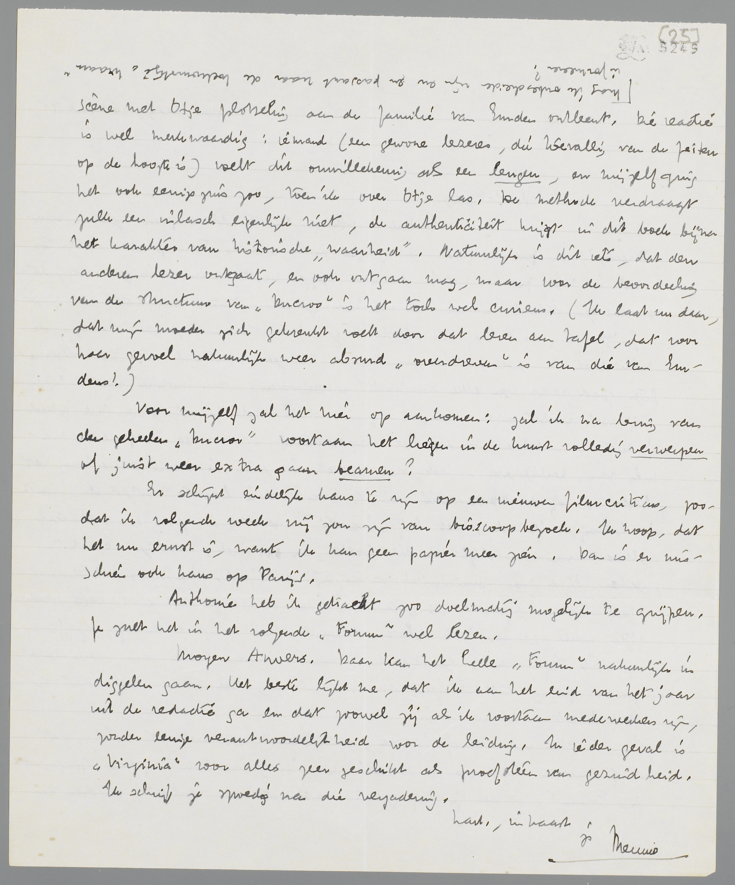Morgen Anvers. Daar kan het heele Forum natuurlijk in diggelen gaan. Het beste lijkt me, dat ik aan het eind van het jaar uit de redactie ga en dat zoowel jij als ik voortaan medewerkers zijn, zonder eenige verantwoordelijkheid voor de leiding. In ieder geval is Virginia voor alles zeer geschikt als proefsteen van gezindheid. Ik schrijf je spoedig na dien vergadering.