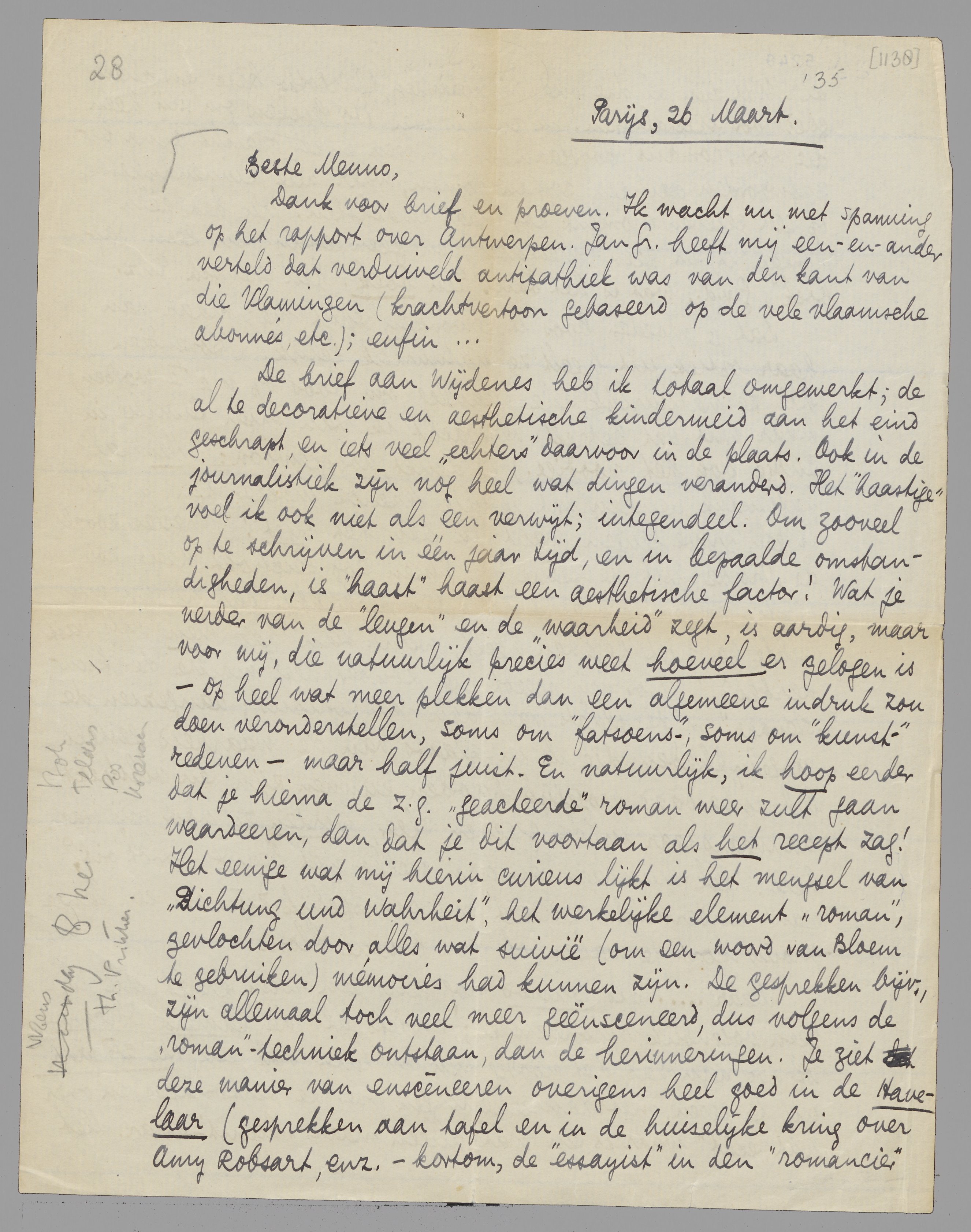 De brief aan Wijdenes heb ik totaal omgewerkt; de al te decoratieve en aesthetische kindermeid aan het eind geschrapt en iets veel ‘echters’ daarvoor in de plaats. Ook in de journalistiek zijn nog heel wat dingen veranderd. Het ‘haastige’ voel ik ook niet als een verwijt; integendeel. Om zooveel op te schrijven in één jaar tijd, en in bepaalde omstandigheden, is ‘haast’ haast een aesthetische factor! Wat je verder van de ‘leugen’ en de ‘waarheid’ zegt, is aardig, maar voor mij, die natuurlijk precies weet hoeveel er gelogen is - op heel wat meer plekken dan een algemeene indruk zou doen veronderstellen, soms om ‘fatsoens’-, soms om ‘kunst’-redenen - maar half juist. En natuurlijk, ik hoop eerder dat je hierna de z.g. ‘geacteerde’ roman weer zult gaan waardeeren, dan dat je dit voortaan als het recept zag! Het eenige wat mij hierin curieus lijkt is het mengsel van ‘Dichtung und Wahrheit’, het werkelijke element ‘roman’, gevlochten door alles wat suivië (om een woord van Bloem te gebruiken) mémoires had kunnen zijn. De gesprekken bijv., zijn allemaal toch veel meer geënsceneerd, dus volgens de ‘roman’ techniek ontstaan, dan de herinneringen. Je ziet deze manier van enscèneeren overigens heel goed in de Havelaar (gesprekken aan tafel en in de huiselijke kring over Amy Robsart, enz. - kortom, de ‘essayist’ in den ‘romancier’ al). Wat zijn al die onderscheidingen tenslotte bête, en alleen goed voor specialisten! ik zie nu wel 100 boeken om mij heen die voor ‘romans’ doorgaan en in geen enkel opzicht bijna beantwoorden aan den roman-roman, waar alle Binnendijken op een gegeven moment zoo naar smachtten. Als het géén ‘roman’ is, en géén ‘mémoires’, en géén ‘essay’ en géén ‘dagboek’, G.v.d. wat is het dan? Een boek. Een mensch. Enz.