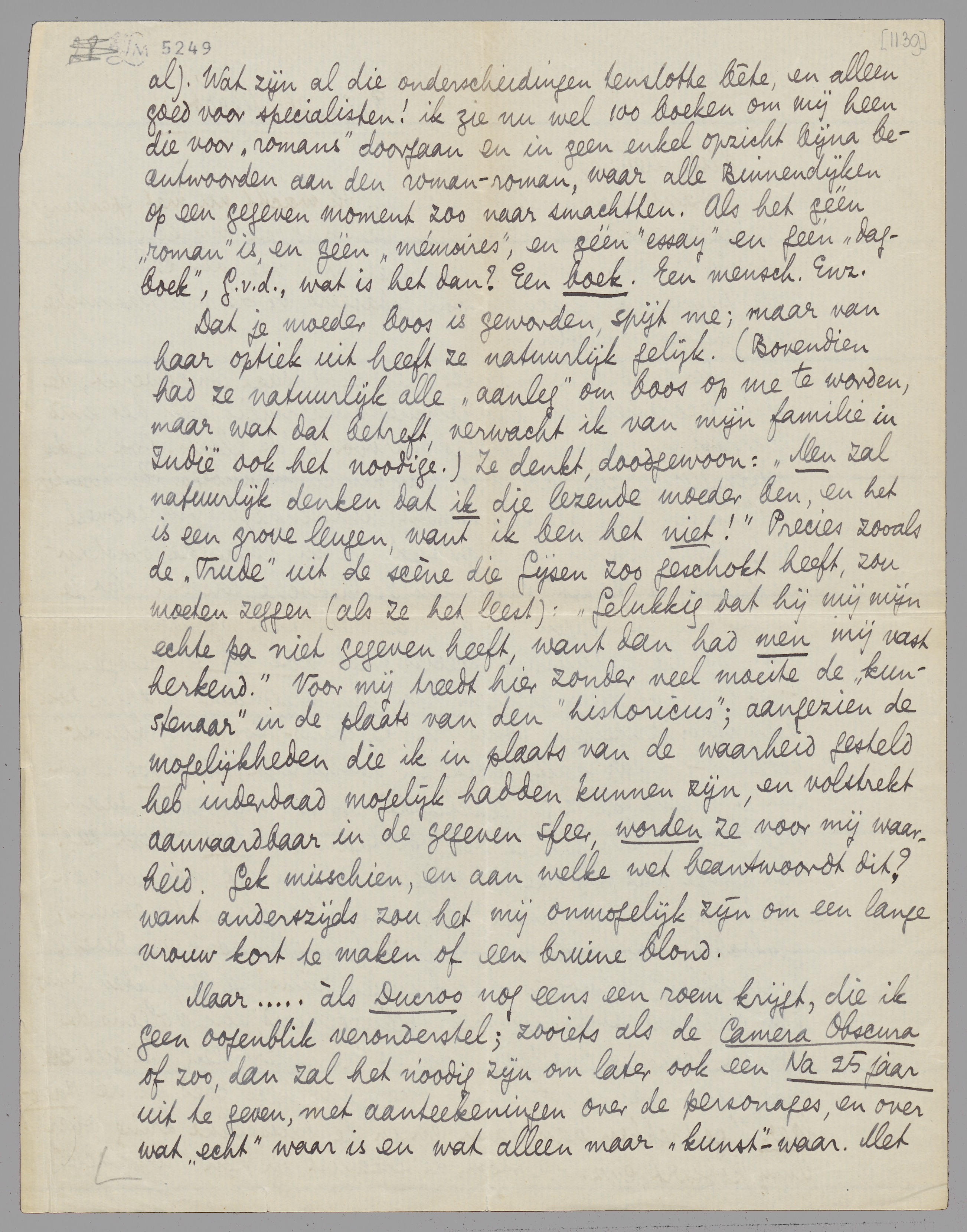 Dat je moeder boos is geworden, spijt me; maar van haar optiek uit heeft ze natuurlijk gelijk. (Bovendien had ze natuurlijk alle ‘aanleg’ om boos op me te worden, maar wat dat betreft, verwacht ik van mijn familie in Indië ook het noodige.) Ze denkt, doodgewoon: ‘Men zal natuurlijk denken dat ik die lezende moeder ben, en het is een grove leugen, want ik ben het niet!’ Precies zooals de ‘Trude’ uit de scène die Gijsen zoo geschokt heeft, zou moeten zeggen (als ze het leest): ‘Gelukkig dat hij mij mijn echte pa niet gegeven heeft, want dan had men mij vast herkend’. Voor mij treedt hier zonder veel moeite de ‘kunstenaar’ in de plaats van den ‘historicus’; aangezien de mogelijkheden die ik in plaats van de waarheid gesteld heb inderdaad mogelijk hadden kunnen zijn, en volstrekt aanvaardbaar en in de gegeven sfeer, worden ze voor mij waarheid. Gek misschien, en aan welke wet beantwoordt dit? want anderzijds zou het mij onmogelijk zijn om een lange vrouw kort te maken of een bruine blond.