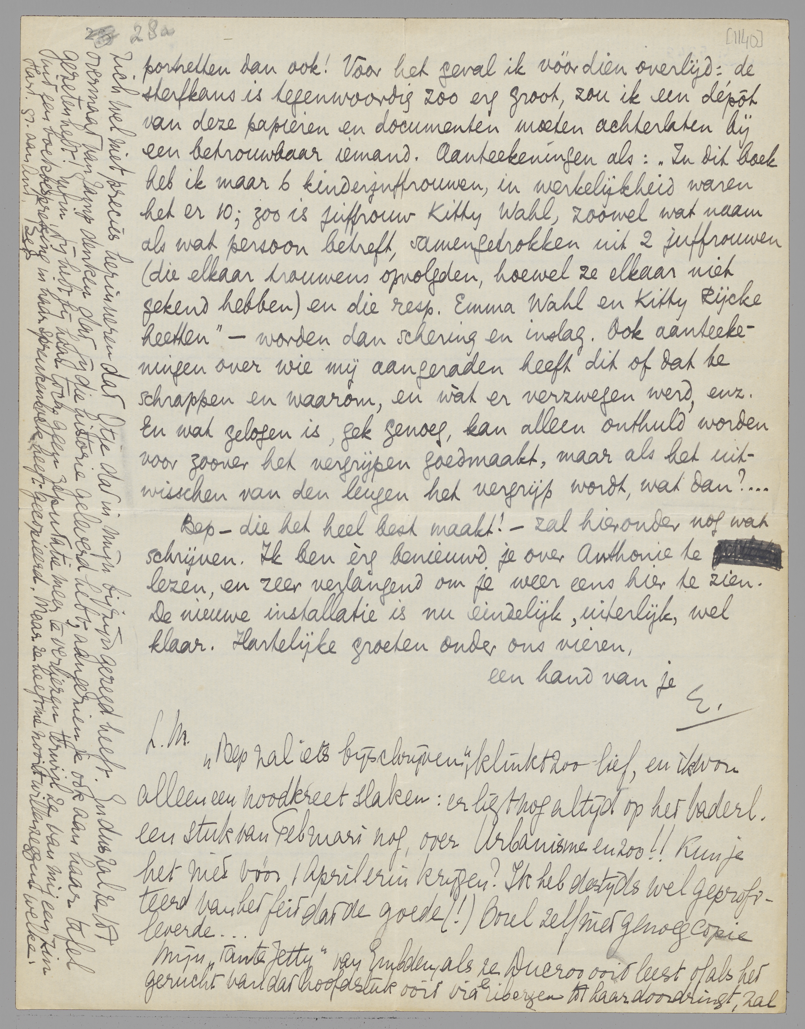 ‘Bep zal iets bijschrijven’, klinkt zoo lief, en ik wou alleen een noodkreet slaken: er ligt nog altijd op het Vaderl. een stuk van Februari nog, over Urbanisme en zoo!! Kun je het niet vóor 1 April erin krijgen? Ik heb destijds wel geprofiteerd van het feit dat de goede(!) Borel zelf niet genoeg copie leverde...