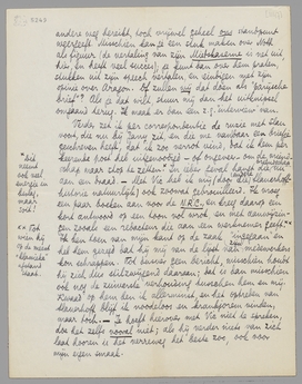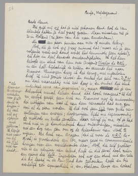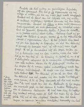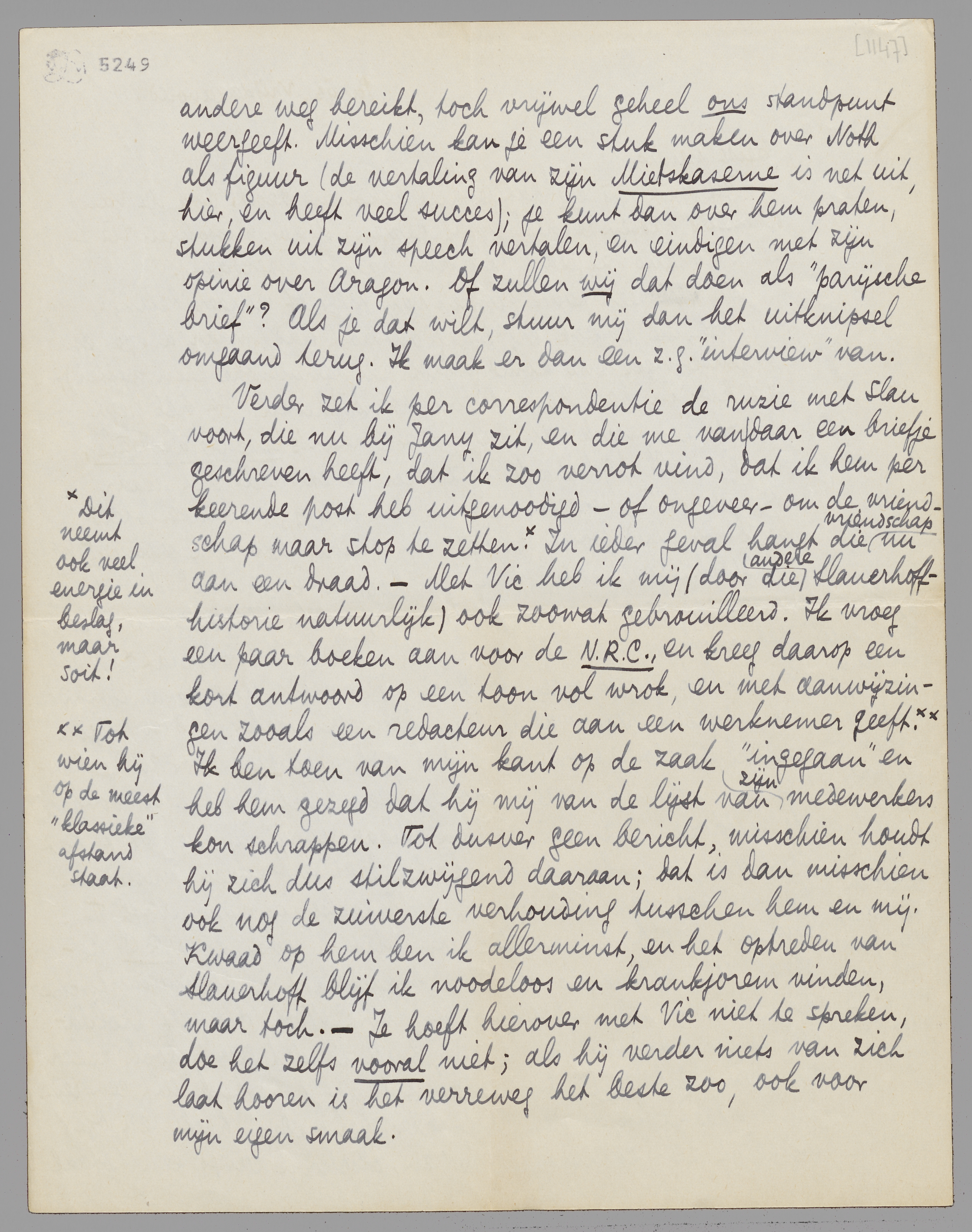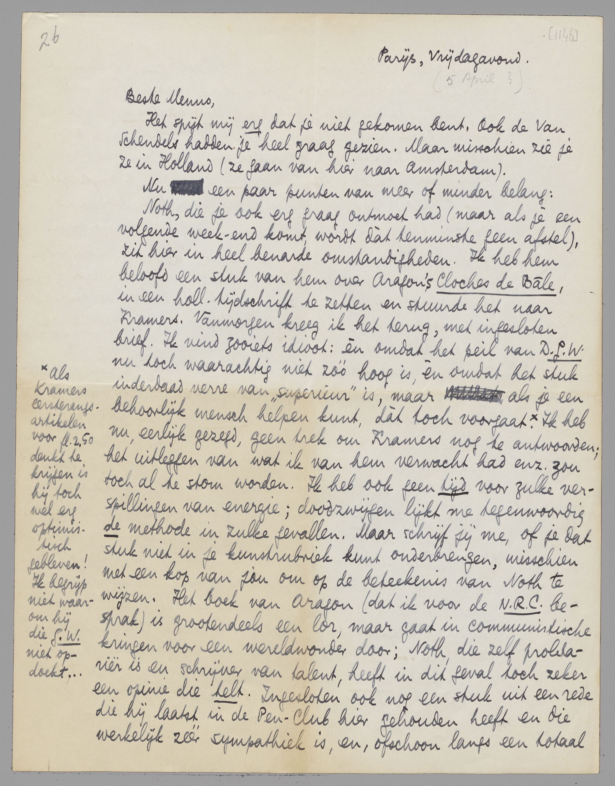 Noth, die je ook erg graag ontmoet had (maar als je een volgende week-end komt, wordt dàt tenminste geen afstel), zit hier in heel benarde omstandigheden. Ik heb hem beloofd een stuk van hem over Aragon's Cloches de Bâle, in een holl. tijdschrift te zetten en stuurde het naar Kramers. Vanmorgen kreeg ik het terug, met ingesloten brief. Ik vind zooiets idioot: èn omdat het peil van D.G.W. nu toch waarachtig niet zóó hoog is, èn omdat het stuk inderdaad verre van ‘superieur’ is, maar als je een behoorlijk mensch helpen kunt, dàt toch voorgaat. [Als Kramers eersterangs artikelen voor ƒ 2.50 denkt te krijgen is hij toch wel erg optimistisch gebleven! Ik begrijp niet waarom hij die G.W. niet opdoekt...] Ik heb nu, eerlijk gezegd, geen trek om Kramers nog te antwoorden; het uitleggen van wat ik van hem verwacht had enz. zou toch al te stom worden. Ik heb ook geen tijd voor zulke verspillingen van energie; doodzwijgen lijkt me tegenwoordig de methode in zulke gevallen. Maar schrijf jij me, of je dat stuk niet in je kunstrubriek kunt onderbrengen, misschien met een kop van jou om op de beteekenis van Noth te wijzen. Het boek van Aragon (dat ik voor de N.R.C. besprak) is grootendeels een lor, maar gaat in communistische kringen voor een wereldwonder door; Noth, die zelf proletariër is en schrijver van talent, heeft in dit geval toch zeker een opinie die telt. Ingesloten ook nog een stuk uit een rede die hij laatst in de Pen-Club hier gehouden heeft en die werkelijk zéér sympathiek is, en, ofschoon langs een totaal andere weg bereikt, toch vrijwel geheel ons standpunt weergeeft. Misschien kan je een stuk maken over Noth als figuur (de vertaling van zijn Mietskaserne is net uit, hier, en heeft veel succes); je kunt dan over hem praten, stukken uit zijn speech vertalen, en eindigen met zijn opinie over Aragon. Of zullen wij dat doen als ‘parijsche brief’? Als je dat wilt, stuur mij dan het uitknipsel omgaand terug. Ik maak er dan een z.g. ‘interview’ van.