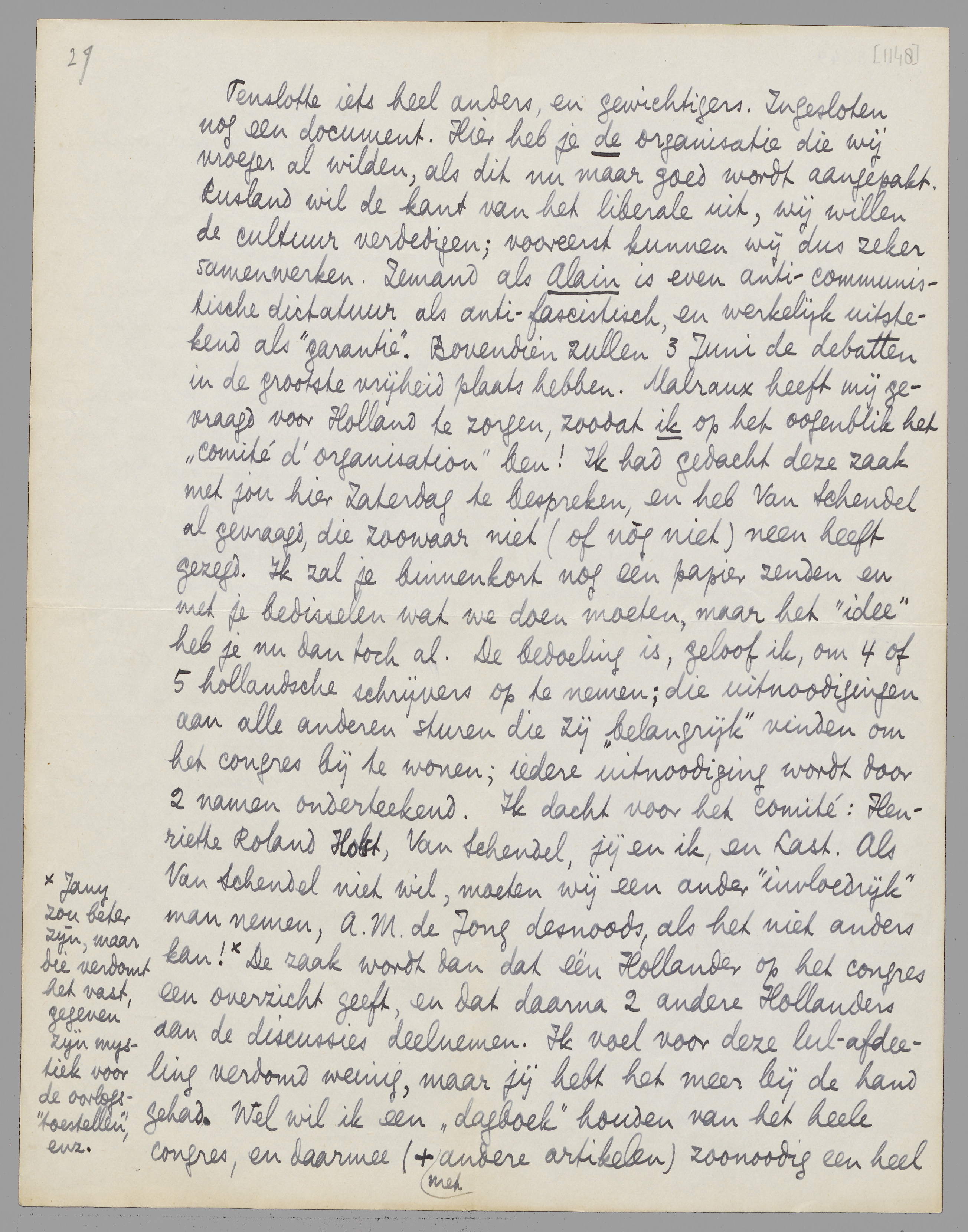 Tenslotte iets heel anders, en gewichtigers. Ingesloten nog een document. Hier heb je de organisatie die wij vroeger al wilden, als dit nu maar goed wordt aangepakt. Rusland wil de kant van het liberale uit, wij willen de cultuur verdedigen; vooreerst kunnen wij dus zeker samenwerken. Iemand als Alain is even anti-communistische dictatuur als anti-fascistisch, en werkelijk uitstekend als ‘garantie’. Bovendien zullen 3 Juni de debatten in de grootste vrijheid plaats hebben. Malraux heeft mij gevraagd voor Holland te zorgen, zoodat ik op het oogenblik het ‘comité d'organisation’ ben! Ik had gedacht deze zaak met jou hier Zaterdag te bespreken, en heb Van Schendel al gevraagd, die zoowaar niet (of nòg niet) neen heeft gezegd. Ik zal je binnenkort nog een papier zenden en met je bedisselen wat we doen moeten, maar het ‘idee’ heb je nu dan toch al. De bedoeling is, geloof ik, om 4 of 5 hollandsche schrijvers op te nemen; die uitnoodigingen aan alle anderen sturen die zij ‘belangrijk’ vinden om het congres bij te wonen; iedere uitnoodiging wordt door 2 namen onderteekend. Ik dacht voor het comité: Henriette Roland Holst, Van Schendel, jij en ik, en Last. Als Van Schendel niet wil, moeten wij een ander ‘invloedrijk’ man nemen, A.M. de Jong desnoods, als het niet anders kan! [Jany zou beter zijn, maar die verdomt het vast, gegeven zijn mystiek voor de oorlogs-‘toestellen’, enz.] De zaak wordt dan dat één Hollander op het congres een overzicht geeft, en dat daarna 2 andere Hollanders aan de discussies deelnemen. Ik voel voor deze lul-afdeeling verdomd weinig, maar jij hebt het meer bij de hand gehad. Wel wil ik een ‘dagboek’ houden van het heele congres, en daarmee (+ met andere artikelen) zoonoodig een heel Forum-nr. vullen, want dit congres kan voor òns heel wat belangrijker uitvallen dan dat van Moskou onlangs.