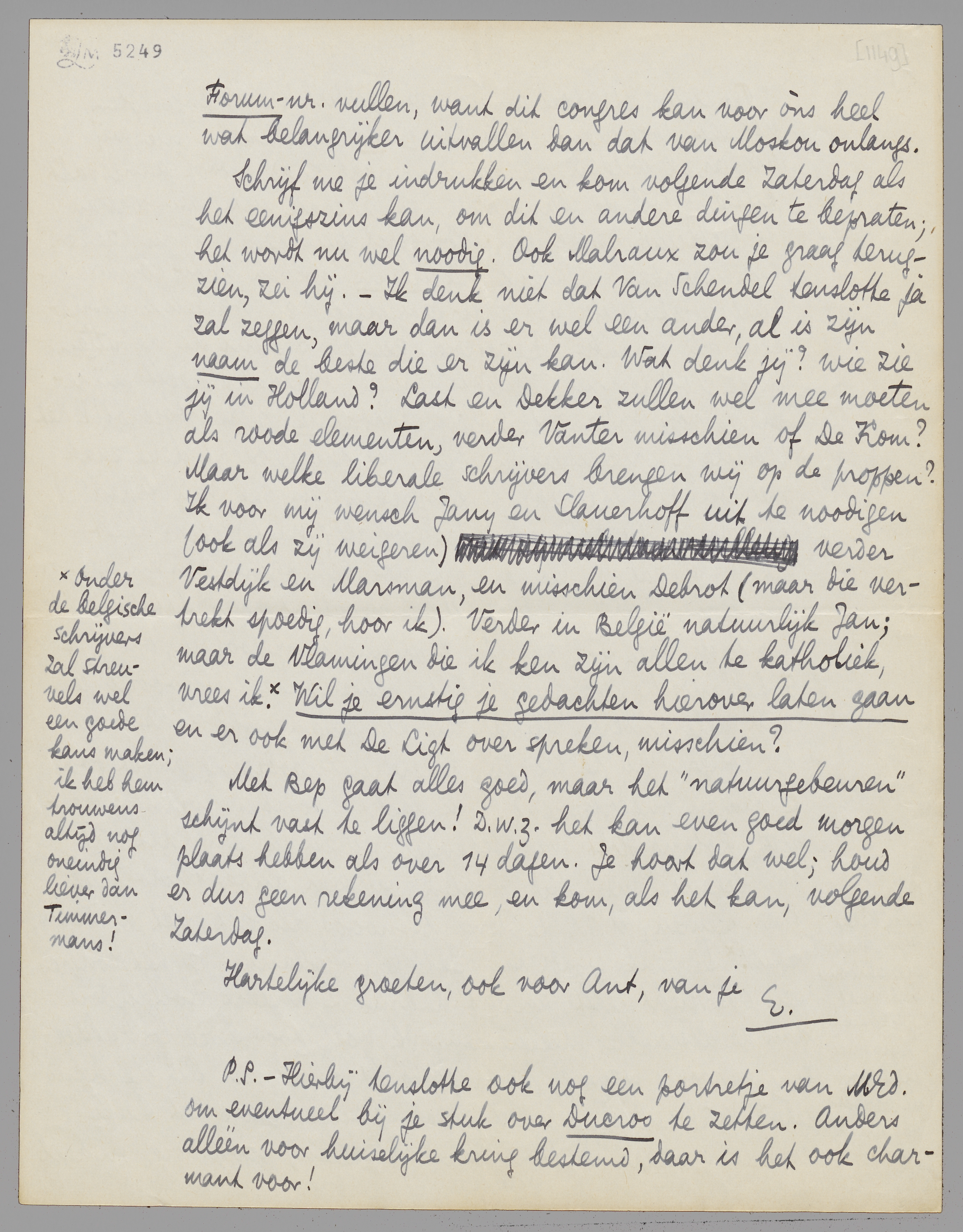 Schrijf me je indrukken en kom volgende Zaterdag als het eenigszins kan, om dit en andere dingen te bepraten; het wordt nu wel noodig. Ook Malraux zou je graag terugzien, zei hij. - Ik denk niet dat Van Schendel tenslotte ja zal zeggen, maar dan is er wel een ander, al is zijn naam de beste die er zijn kan. Wat denk jij? wie zie jij in Holland? Last en Dekker zullen wel mee moeten als roode elementen, verder Vanter misschien of De Kom? Maar welke liberale schrijvers brengen wij op de proppen? Ik voor mij wensch Jany en Slauerhoff uit te noodigen (ook als zij weigeren) verder Vestdijk en Marsman, en misschien Debrot (maar die vertrekt spoedig, hoor ik). Verder in België natuurlijk Jan; maar de Vlamingen die ik ken zijn allen te katholiek, vrees ik. [Onder de belgische schrijvers zal Streuvels wel een goede kans maken; ik heb hem trouwens altijd nog oneindig liever dan Timmermans!] Wil je ernstig je gedachten hierover laten gaan en er ook met De Ligt over spreken, misschien?