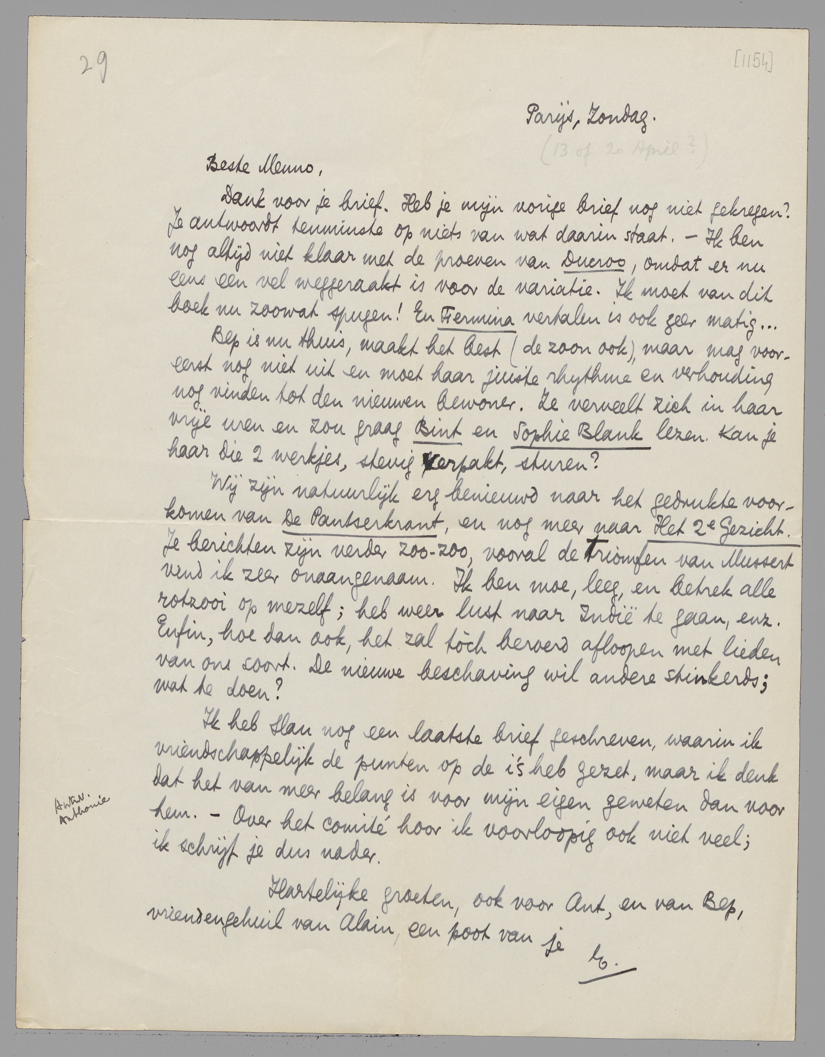 Wij zijn natuurlijk erg benieuwd naar het gedrukte voorkomen van De Pantserkrant, en nog meer naar Het 2e Gezicht. Je berichten zijn verder zoo-zoo, vooral de triomfen van Mussert vind ik zeer onaangenaam. Ik ben moe, leeg, en betrek alle rotzooi op mezelf; heb weer lust naar Indië te gaan, enz. Enfin, hoe dan ook, het zal tòch beroerd afloopen met lieden van ons soort. De nieuwe beschaving wil andere stinkerds; wat te doen?
