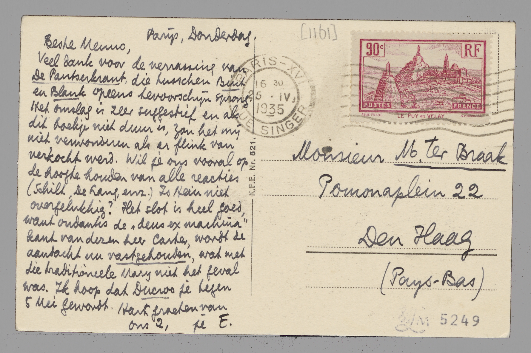 Veel dank voor de verrassing van De Pantserkrant, die tusschen Bint en Blank opeens tevoorschijn sprong. Het omslag is zeer suggestief en als dit boekje niet duur is, zou het mij niet verwonderen als er flink van verkocht werd. Wil je ons vooral op de hoogte houden van alle reacties (Schilt, De Lang, enz.) Is Hein niet overgelukkig? Het slot is heel goed, want ondanks de ‘deus ex machina’ kant van dezen heer Carter, wordt de aandacht nu vastgehouden, wat met die traditioneele Mary niet het geval was. Ik hoop dat Ducroo je tegen 5 Mei gewordt. Hart. groeten van ons 2,