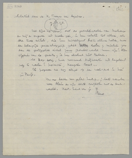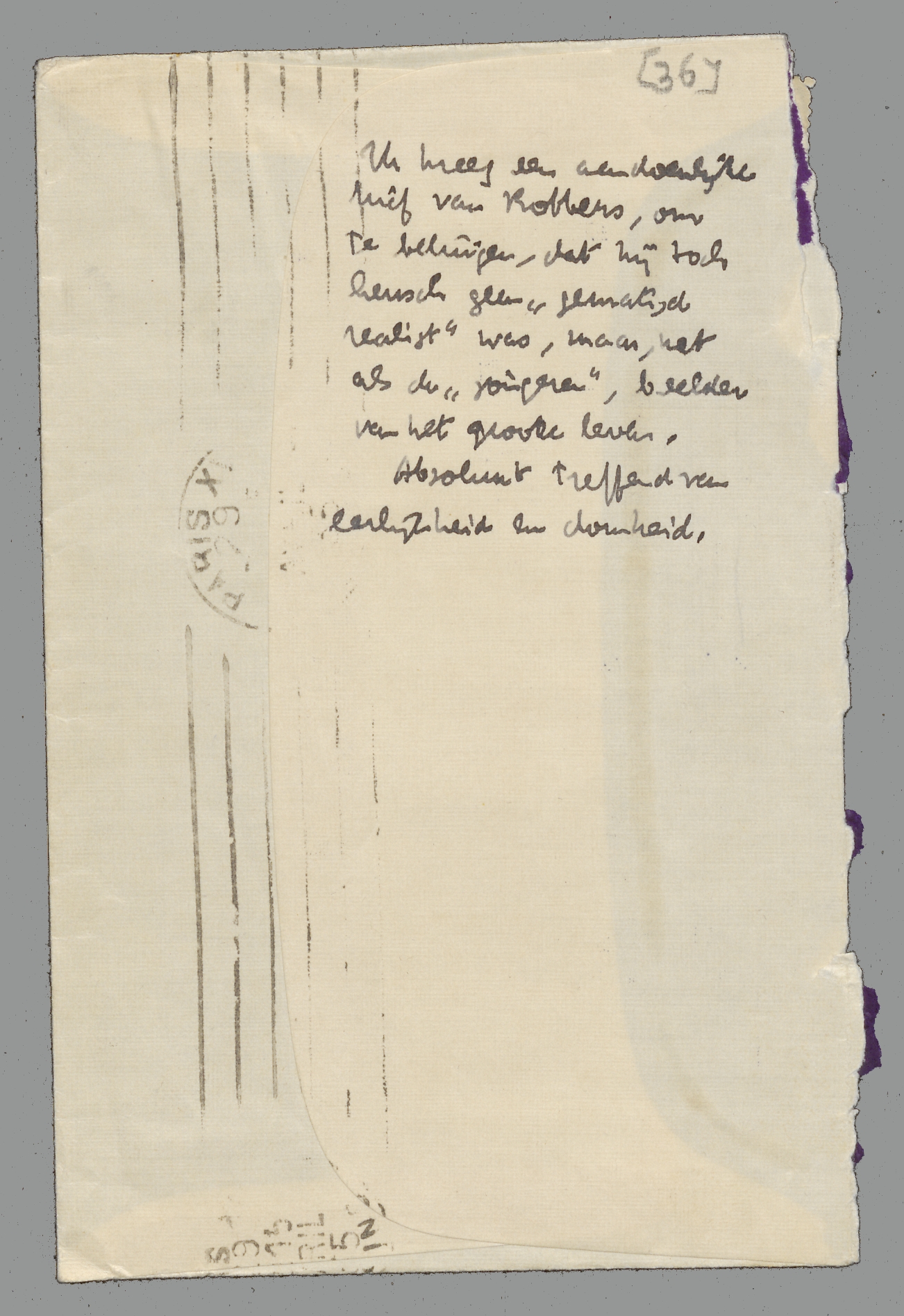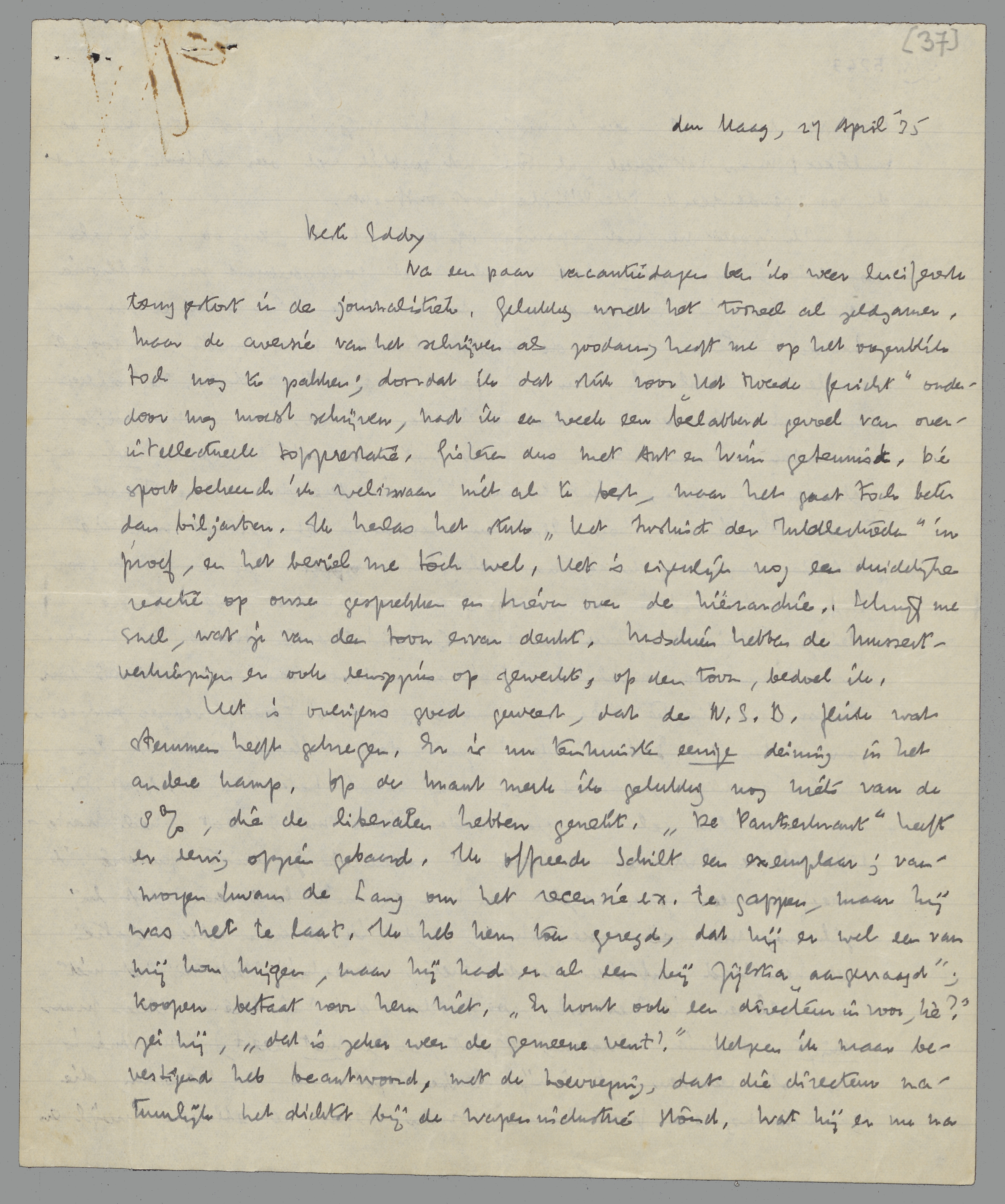 Na een paar vacantiedagen ben ik weer luciferesk teruggestort in de journalistiek. Gelukkig wordt het tooneel al zeldzamer, maar de aversie van het schrijven als zoodanig heeft me op het oogenblik toch nog te pakken; doordat ik dat stuk voor Het Tweede Gezicht onderdoor nog moest schrijven, had ik een week een belabberd gevoel van overintellectueele topprestatie. Gisteren dus met Ant en Wim getennist. Die sport beheersch ik weliswaar niet al te best, maar het gaat toch beter dan biljarten. Ik herlas het stuk Het Instinct der Intellectueelen in proef, en het beviel me toch wel. Het is eigenlijk nog een duidelijke reactie op onze gesprekken en brieven over de hiërarchie. Schrijf me snel, wat je van den toon ervan denkt. Misschien hebben de Mussert-verkiezingen er ook eenigszins op gewerkt, op den toon, bedoel ik.