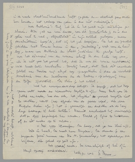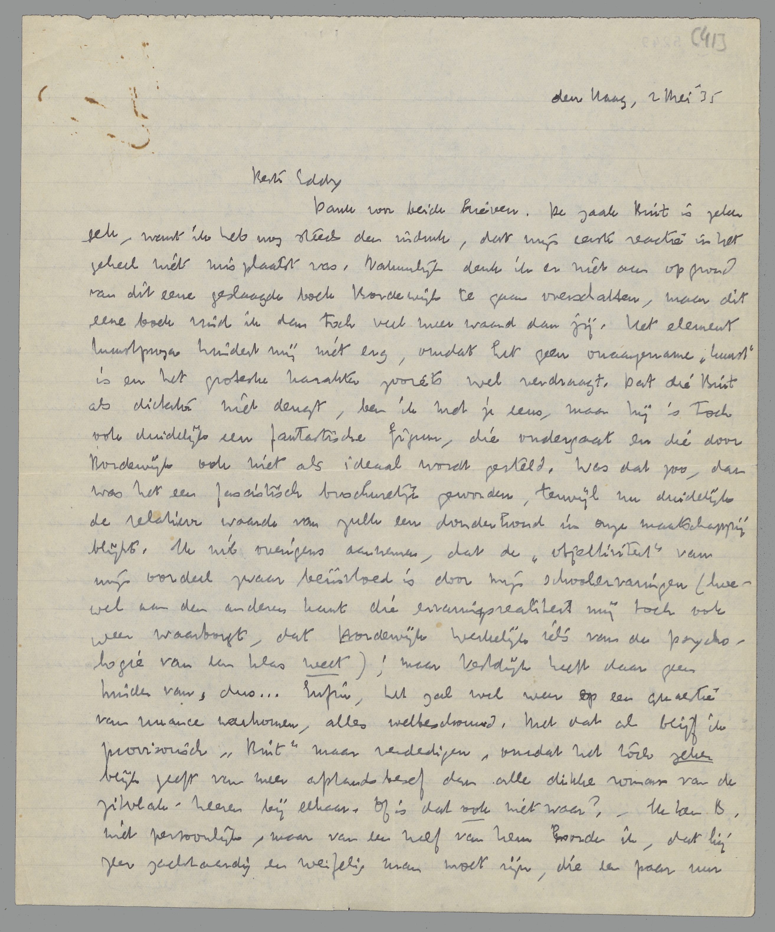 Over Anthonie's turf heb ik in het zweet mijns aanschijns geschreven. Alles zat me weer dwars, voor dit krantenstuk; er is dus zeker veel te veel ‘objectiviteit’ in mijn artikel geslopen, maar desalniettemin hoop ik, dat hij het zal begrijpen. Ik heb een parallel getrokken met Thomas Mann in den Zauberberg, wat voor de hand lag, maar voor Anthonie een slecht judicium ten gevolge heeft. Over het démasqué van den roman schrijf ik dan later nog eens, als ik niet zoo het gevoel heb, dat ik over één roman rechtvaardigheid moet laten neerstralen. Daarbij komt, dat toch dit vervelende geklets van Donker mij altijd nog sympathieker is dan de revolutie-bombarie van den Sneekenaar en de Balkan-opschepperij van den toffen sjoernelist. Ik stuur je het artikel.