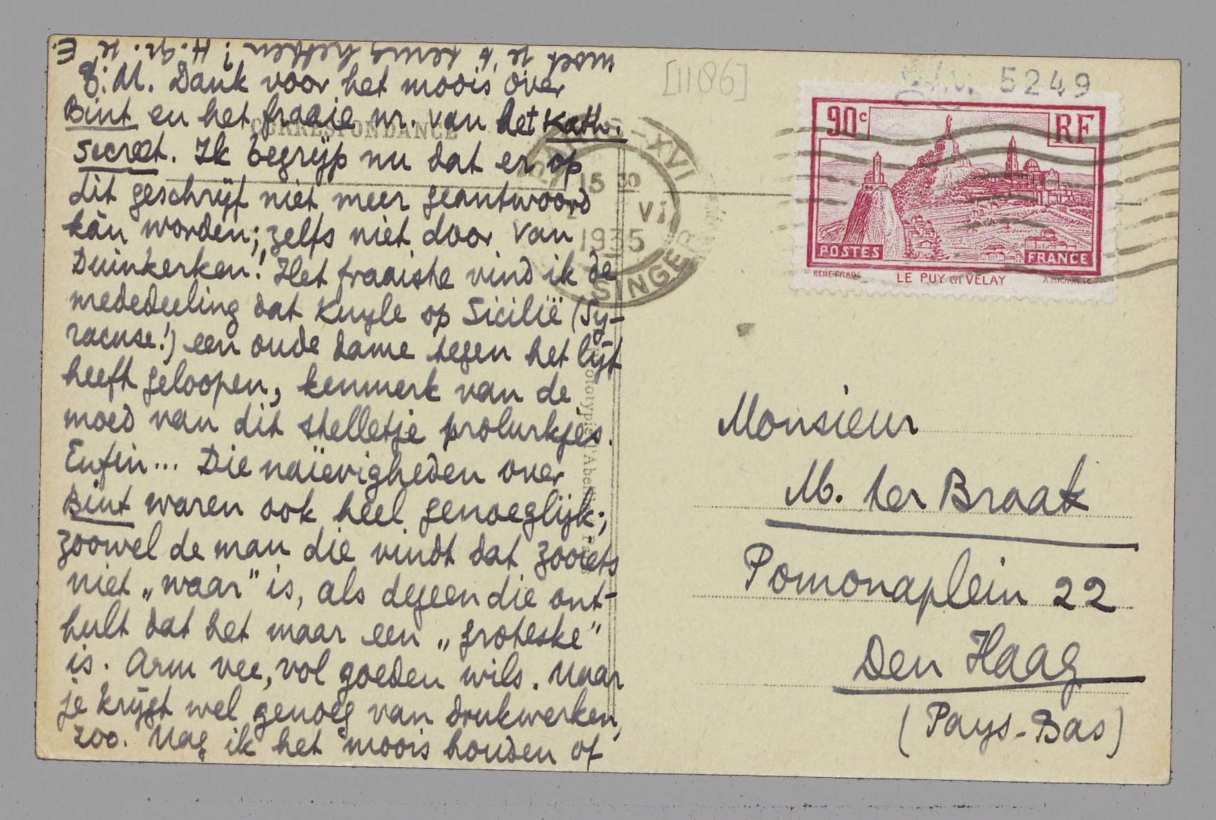 Dank voor het moois over Bint en het fraaie nr. van het Kath. secreet. Ik begrijp nu dat er op dit geschrijf niet meer geantwoord kàn worden; zelfs niet door Van Duinkerken! Het fraaiste vind ik de mededeeling dat Kuyle op Sicilië (Syracuse!) een oude dame tegen het lijf heeft geloopen, kenmerk van de moed van dit stelletje prolurkjes. Enfin... Die naïevigheden over Bint waren ook heel genoeglijk; zoowel de man die vindt dat zooiets niet ‘waar’ is, als degeen die onthult dat het maar een ‘groteske’ is. Arm vee, vol goeden wils. Maar je krijgt wel genoeg van drukwerken, zoo. Mag ik het moois houden of moet je 't terug hebben? H. gr. je