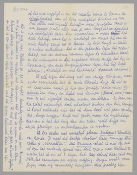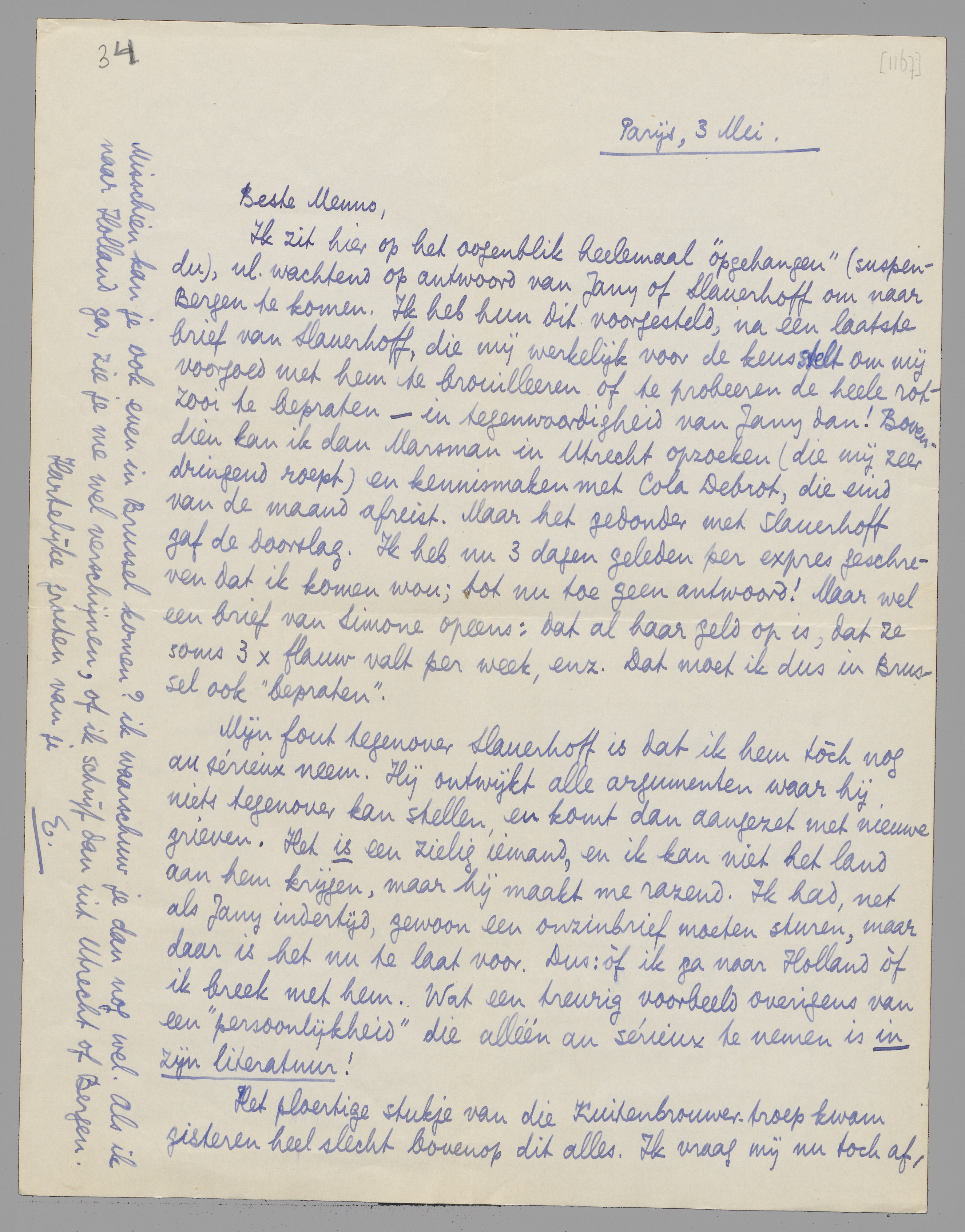 Ik zit hier op het oogenblik heelemaal ‘opgehangen’ (suspendu), nl. wachtend op antwoord van Jany of Slauerhoff om naar Bergen te komen. Ik heb hun dit voorgesteld, na een laatste brief van Slauerhoff, die mij werkelijk voor de keus stelt om mij voorgoed met hem te brouilleeren of te probeeren de heele rotzooi te bepraten - in tegenwoordigheid van Jany dan! Bovendien kan ik dan Marsman in Utrecht opzoeken (die mij zeer dringend roept) en kennismaken met Cola Debrot, die eind van de maand afreist. Maar het gedonder met Slauerhoff gaf de doorslag. Ik heb nu 3 dagen geleden per expres geschreven dat ik komen wou; tot nu toe geen antwoord! Maar wel een brief van Simone opeens: dat al haar geld op is, dat ze soms 3 × flauw valt per week, enz. Dat moet ik dus in Brussel ook ‘bepraten’.