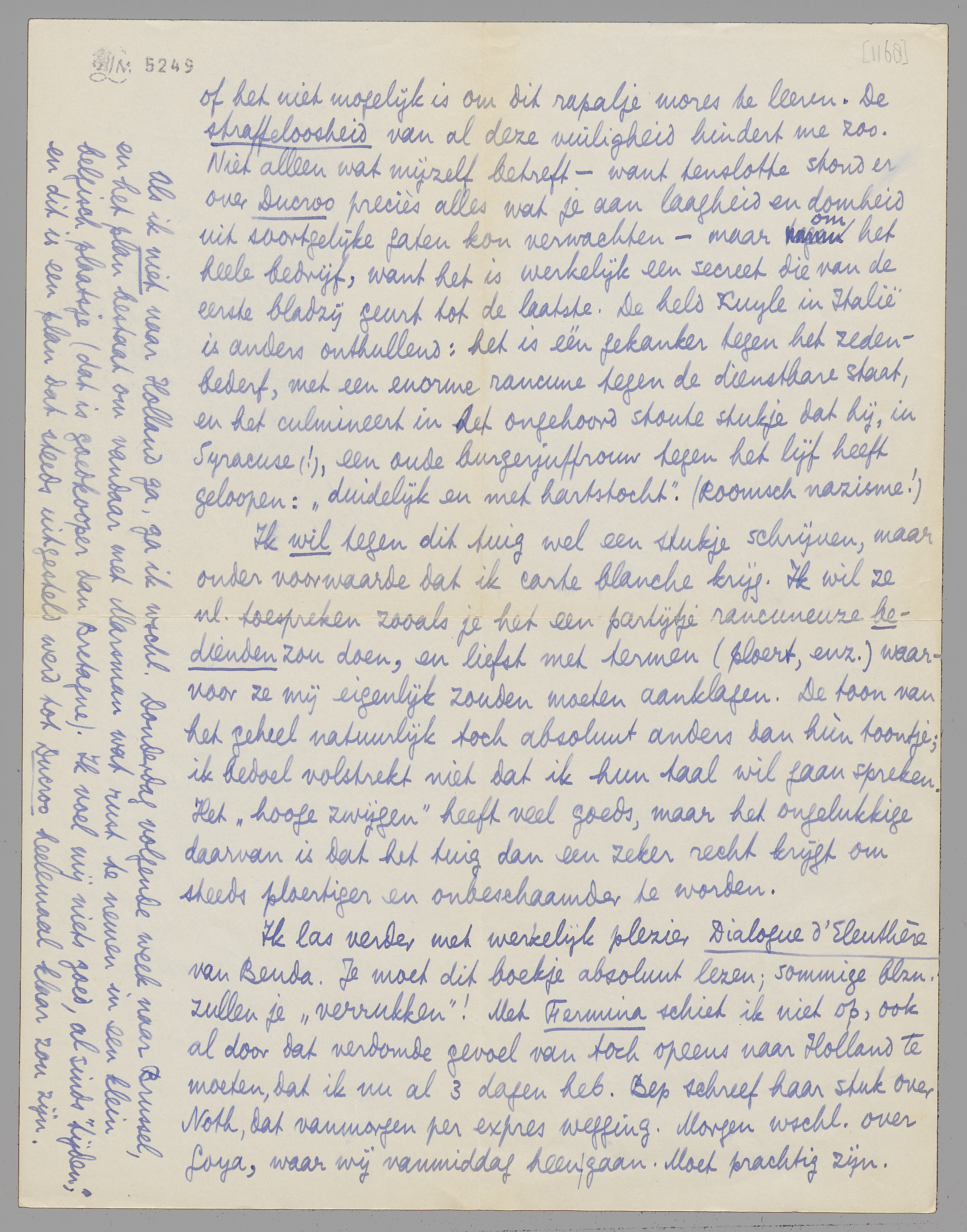 Ik las verder met werkelijk plezier Dialogue d'Eleuthère van Benda. Je moet dit boekje absoluut lezen; sommige blzn. zullen je ‘verrukken’! Met Fermina schiet ik niet op, ook al door dat verdomde gevoel van toch opeens naar Holland te moeten, dat ik nu al 3 dagen heb. Bep schreef haar stuk over Noth, dat vanmorgen per expres wegging. Morgen wschl. over Goya, waar wij vanmiddag heen gaan. Moet prachtig zijn.