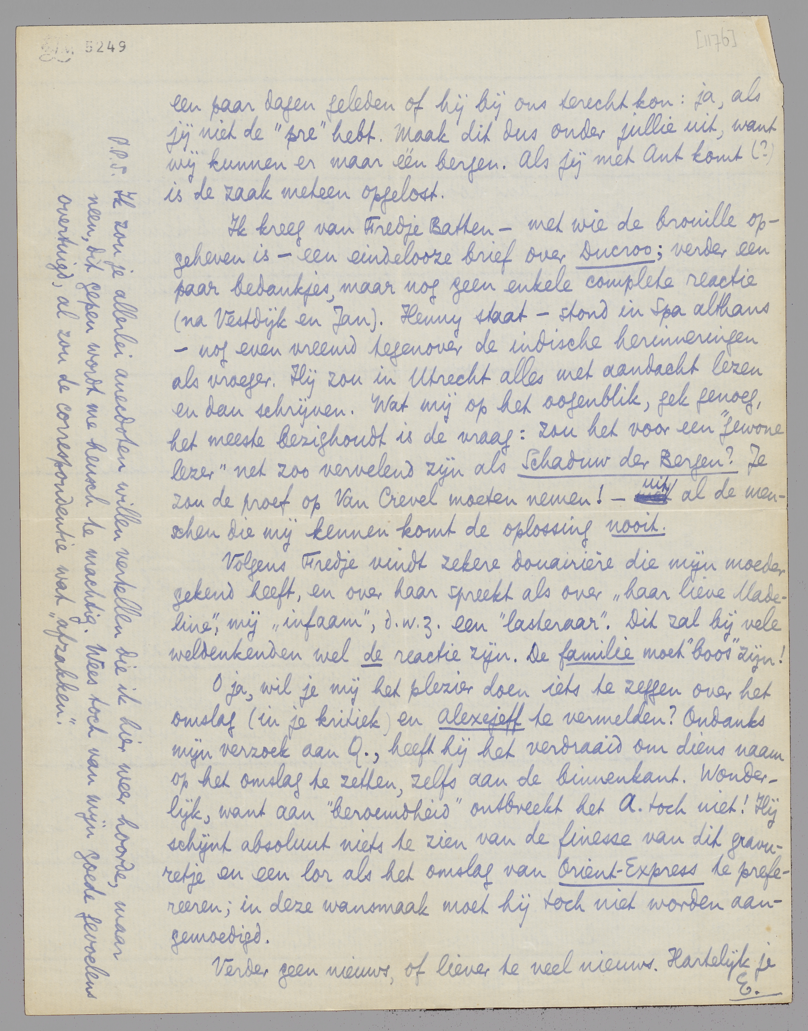O ja, wil je mij het plezier doen iets te zeggen over het omslag (in je kritiek) en Alexejeff te vermelden? Ondanks mijn verzoek aan Q., heeft hij het verdraaid om diens naam op het omslag te zetten, zelfs aan de binnenkant. Wonderlijk, want aan ‘beroemdheid’ ontbreekt het A. toch niet! Hij schijnt absoluut niets te zien van de finesse van dit gravuretje en een lor als het omslag van Oriënt-Express te prefereeren; in deze wansmaak moet hij toch niet worden aangemoedigd.