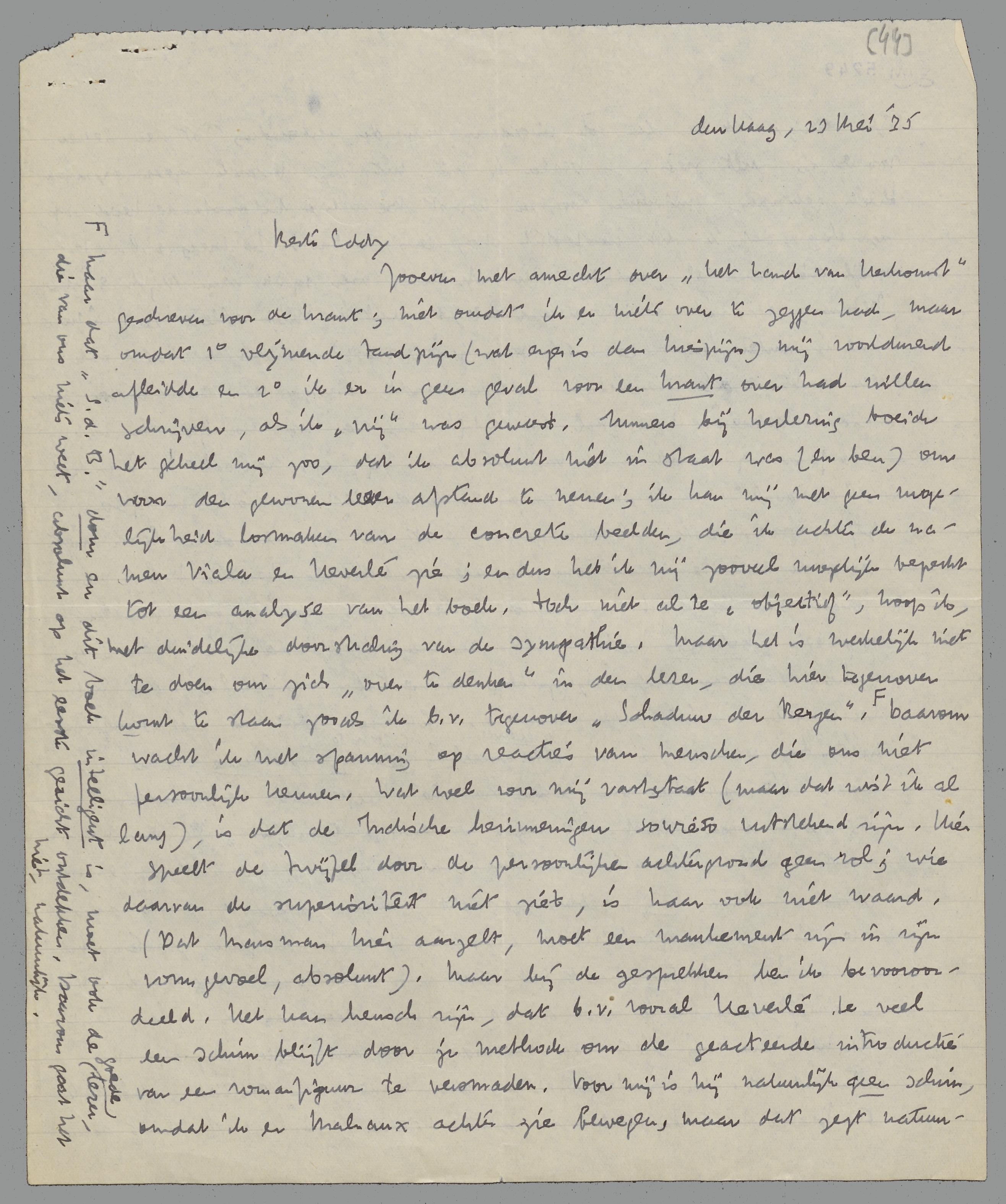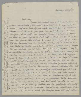 Ik had nog een fraai interview met den duikboot-notaris Koster, dat ik je heb laten zenden. Heel curieus, deze heer, het complete fatsoen en de ‘echtheid’ van b.v. een Muller schitterend bewijzend. Een goochem, humoristisch, vredelievend man, zeker symphathieker dan een dozijn handelaren in tabak of zeep, zooals je op zijn portret ziet gedecoreerd en gesnord. Ik hoop, dat je van zijn logica hebt genoten; het mooiste is eigenlijk, dat hij den heelen tekst eerst wou approuveeren (hij woont in Parijs, quai de Passy, in jullie buurt) en er geen woord aan veranderd heeft; ‘vous avez tout à fait exprimé les mots et le sens de notre conversation’, schreef hij me terug. En vandaag kwam er al een ingezonden stuk van een groote-figuren-pacifist, die het gesprek voor een mystificatie hield, omdat die Koster zich niet demonischer uitdrukte!