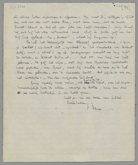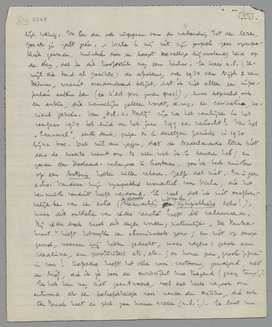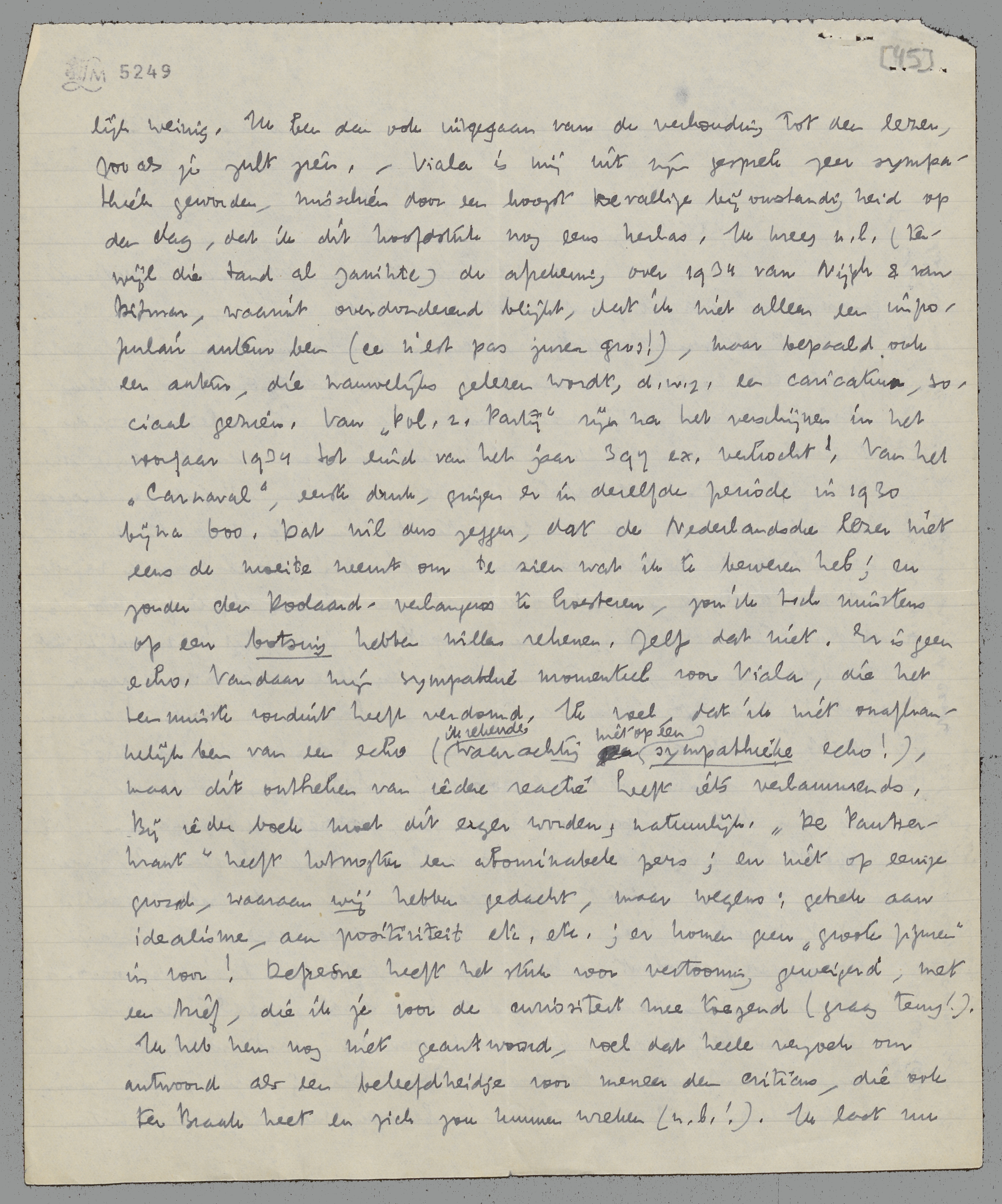 Zooeven met amecht over Het Land van Herkomst geschreven voor de krant; niet omdat ik er niets over te zeggen had, maar omdat 1o vlijmende tandpijn (wat erger is dan kiespijn) mij voortdurend afleidde en 2o ik er in geen geval voor een krant over had willen schrijven, als ik ‘vrij’ was geweest. Immers bij herlezing boeide het geheel mij zoo, dat ik absoluut niet in staat was (en ben) om voor den gewonen lezer afstand te nemen; ik kan mij met geen mogelijkheid losmaken van de concrete beelden, die ik achter de namen Viala en Heverlé zie; en dus heb ik mij zooveel mogelijk beperkt tot een analyse van het boek. Toch niet al te ‘objectief’, hoop ik, met duidelijke doorstraling van de sympathie. Maar het is werkelijk niet te doen om zich ‘over te denken’ in den lezer, die hier tegenover komt te staan zooals ik b.v. tegenover Schaduw der Bergen [Maar dat S.d.B. dom en dit boek intelligent is, moet ook de goede lezer, die van ons niets weet, absoluut op het eerste gezicht ontdekken. Daarom gaat het niet, natuurlijk]. Daarom wacht ik met spanning op reacties van menschen, die ons niet persoonlijk kennen. Wat wel voor mij vaststaat (maar dat wist ik al lang), is dat de Indische herinneringen sowieso uitstekend zijn. Hier speelt de twijfel door de persoonlijke achtergrond geen rol; wie daarvan de superioriteit niet ziet, is haar ook niet waard. (Dat Marsman hier aarzelt, moet een mankement zijn in zijn vormgevoel, absoluut.) Maar bij de gesprekken ben ik bevooroordeeld. Het kan heusch zijn, dat b.v. vooral Heverlé te veel een schim blijft door je methode om de geacteerde introductie van een romanfiguur te versmaden. Voor mij is hij natuurlijk geen schim, omdat ik er Malraux achter zie bewegen, maar dat zegt natuurlijk weinig. Ik ben dan ook uitgegaan van de verhouding tot den lezer, zooals je zult zien. Viala is mij uit zijn gesprek zeer sympathiek geworden, misschien door een hoogst toevallige bijomstandigheid op den dag, dat ik dit hoofdstuk nog eens herlas. Ik kreeg n.l. (terwijl die tand al zanikte) de afrekening over 1934 van Nijgh & van Ditmar, waaruit overdonderend blijkt, dat ik niet alleen een impopulair auteur ben (ce n'est pas jurer gros!), maar bepaald ook een auteur, die nauwelijks gelezen wordt, d.w.z. een caricatuur, sociaal gezien. Van Pol. z. Partij zijn na het verschijnen in het voorjaar 1934 tot eind van het jaar 397 ex. verkocht! Van het Carnaval, eerste druk, gingen er in dezelfde periode in 1930 bijna 600. Dat wil dus zeggen, dat de Nederlandsche lezer niet eens de moeite neemt om te zien wat ik te beweren heb; en zonder den Doolaard-verlangens te koesteren, zou ik toch minstens op een botsing hebben willen rekenen. Zelfs dat niet. Er is geen echo. Vandaar mijn sympathie momenteel voor Viala, die het tenminste ronduit heeft verdomd. Ik voel, dat ik niet onafhankelijk ben van een echo (ik rekende waarachtig niet op een sympathieke echo!), maar dit ontbreken van iedere reactie heeft iets verlammends. Bij ieder boek moet dit erger worden, natuurlijk. De Pantserkrant heeft totnogtoe een abominabele pers; en niet op eenige grond, waaraan wij hebben gedacht, maar wegens: gebrek aan idealisme, aan positiviteit etc. etc.; er komen geen ‘groote figuren’ in voor! Defresne heeft het stuk voor vertooning geweigerd, met een brief, die ik je voor de curiositeit mee toezend (graag terug!). Ik heb hem nog niet geantwoord, voel dat heele verzoek om antwoord als een beleefdheidje voor meneer den criticus, die ook ter Braak heet en zich zou kunnen wreken (n.b.!). Ik laat nu iedere gedachte aan opvoering in Holland varen; mocht er een van de tooneelboeren, uitgezonderd van der Lugt, dien ik weiger, er om komen, dan kan hij zijn gang gaan. In ieder geval doe ik er geen moeite meer voor.
