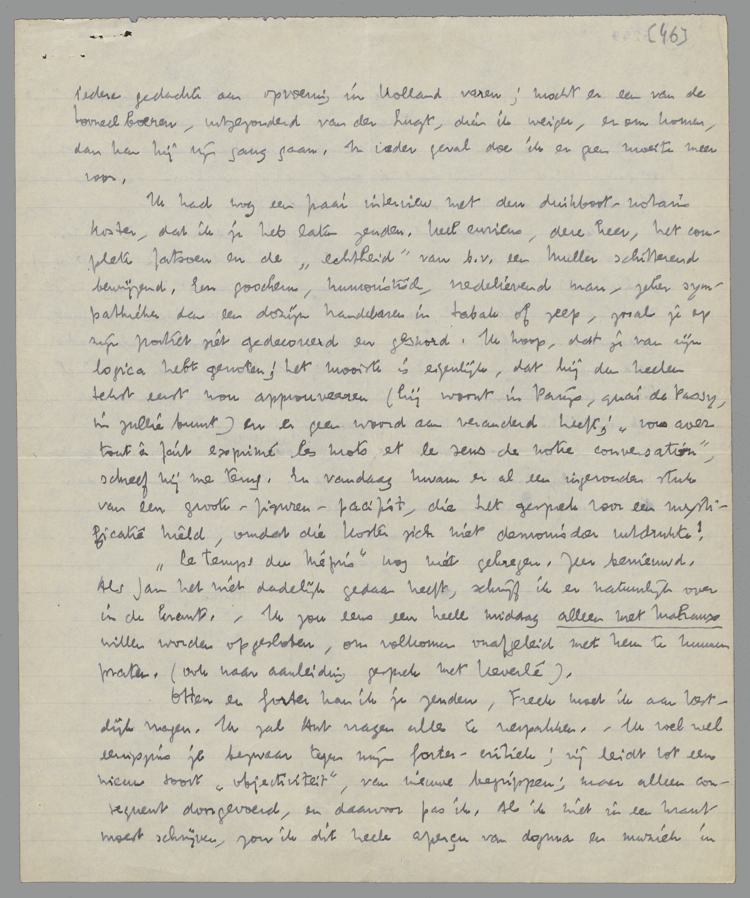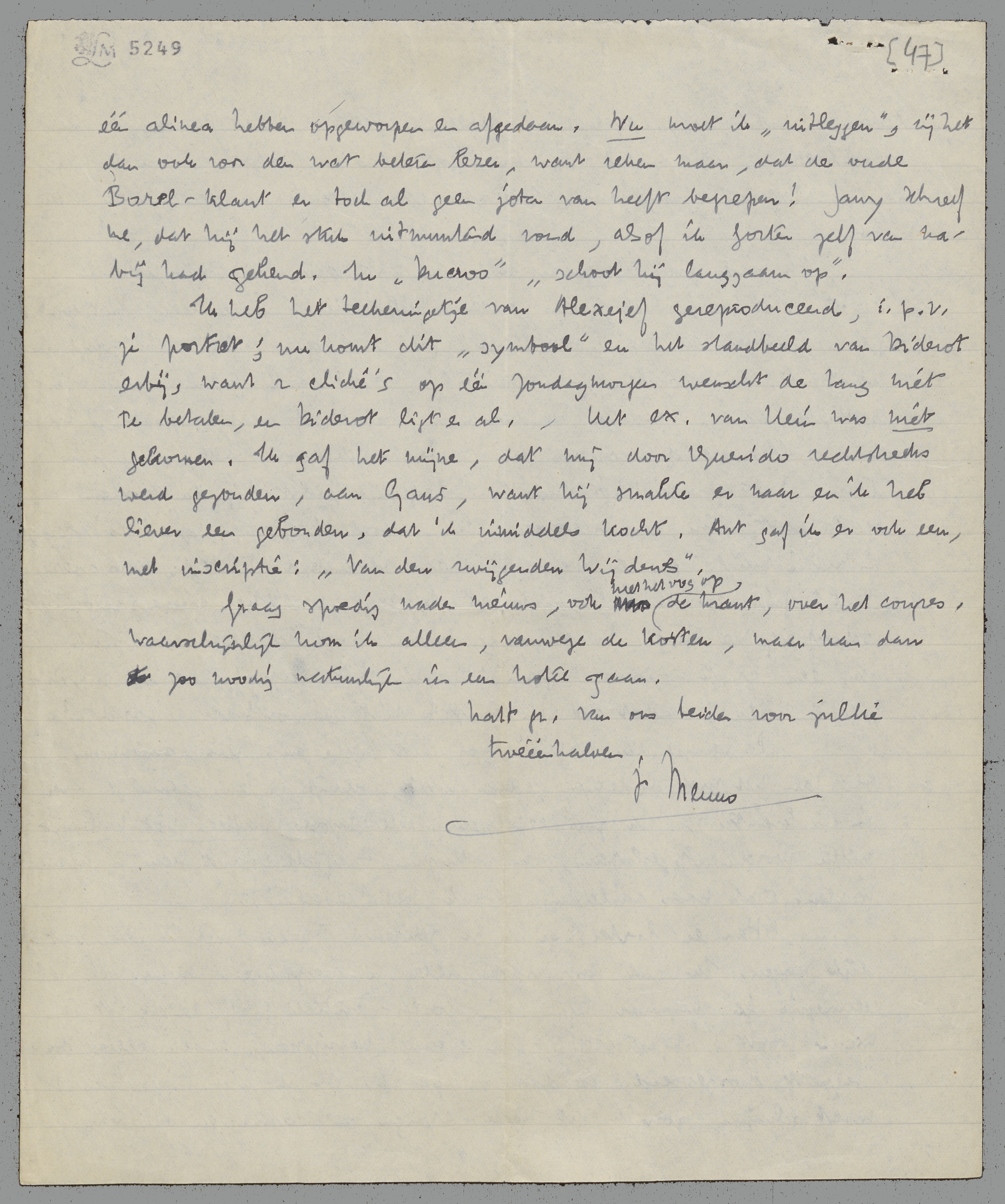 Otten en Gorter kan ik je zenden, Freek moet ik aan Vestdijk vragen. Ik zal Ant vragen alles te verpakken. Ik voel wel enigszins je bezwaar tegen mijn Gorter-critiek; zij leidt tot een nieuw soort ‘objectiviteit’, van nieuwe begrippen; maar alleen consequent doorgevoerd, en daarvoor pas ik. Als ik niet in een krant moest schrijven, zou ik dit heele aperçu van dogma en muziek in één alinea hebben opgeworpen en afgedaan. Nu moet ik ‘uitleggen’, zij het dan ook voor den wat beteren lezer, want reken maar, dat de oude Borel-klant er toch al geen jota van heeft begrepen! Jany schreef me, dat hij het stuk uitmuntend vond, alsof ik Gorter zelf van nabij had gekend. In Ducroo ‘schoot hij langzaam op’.