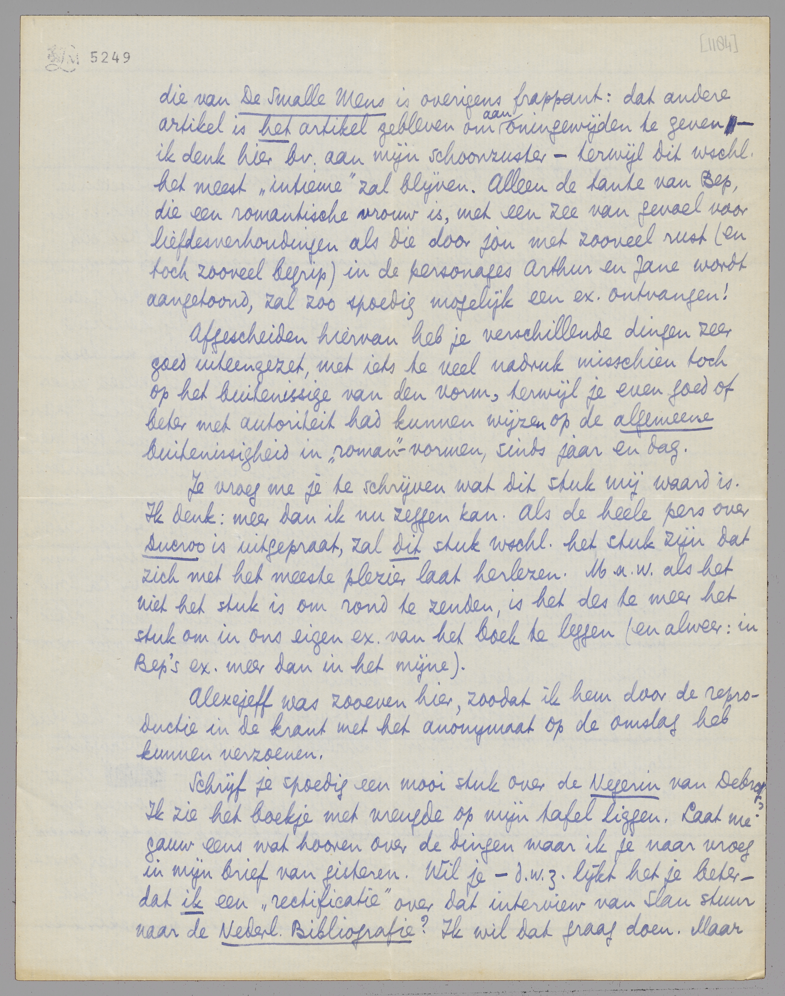 Schrijf je spoedig een mooi stuk over de Negerin van Debrot? Ik zie het boekje met vreugde op mijn tafel liggen. Laat me gauw eens wat hooren over de dingen waar ik je naar vroeg in mijn brief van gisteren. Wil je - d.w.z. lijkt het je beter - dat ik een ‘rectificatie’ over dat interview van Slau stuur naar de Nederl. Bibliografie? Ik wil dat graag doen. Maar sloot ik die 2 blzn. met dat interview misschien in mijn brief van gisteren? ik kan ze nergens meer vinden!