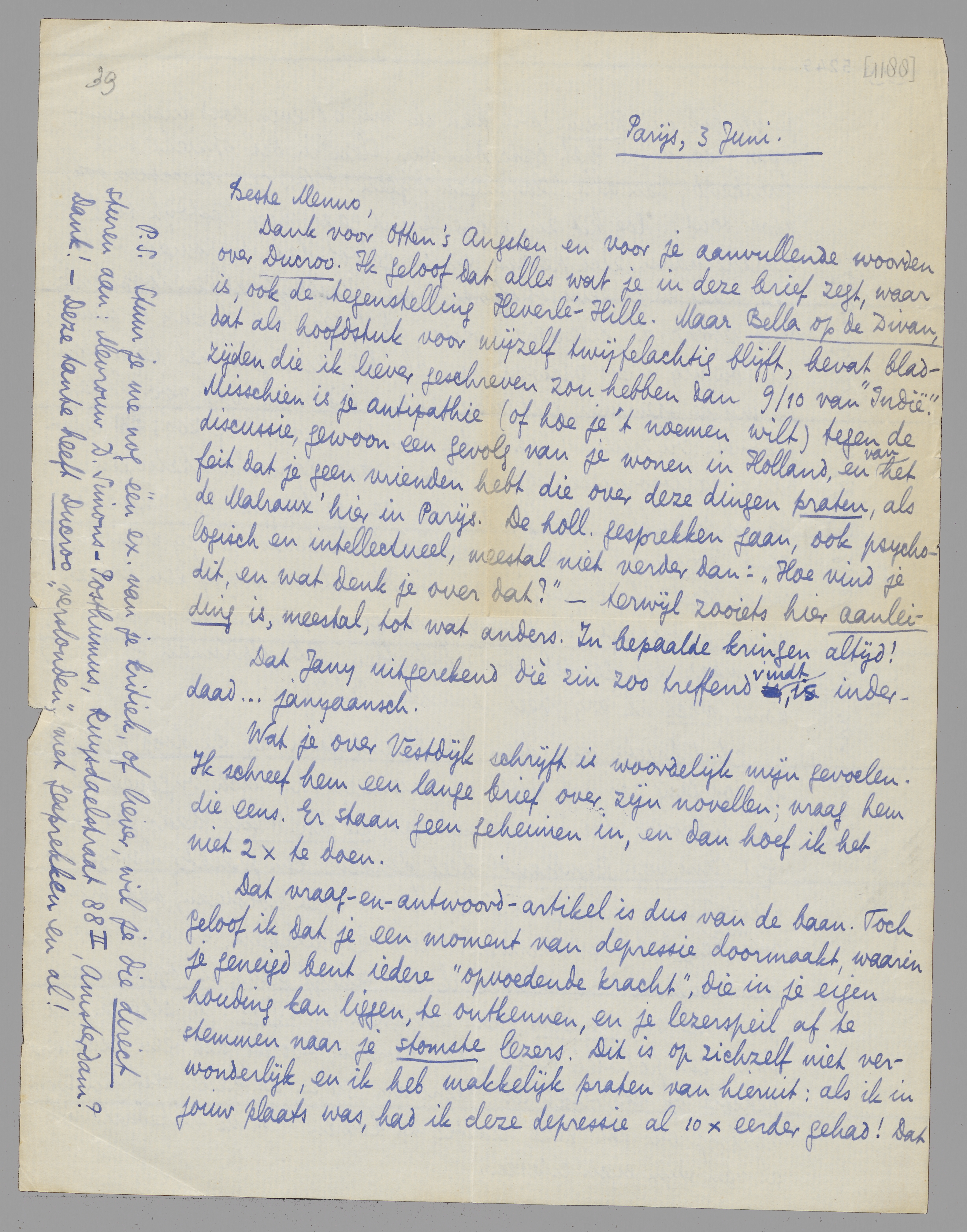 Dank voor Otten's Angsten en voor je aanvullende woorden over Ducroo. Ik geloof dat alles wat je in deze brief zegt, waar is, ook de tegenstelling Heverlé-Hille. Maar Bella op de Divan, dat als hoofdstuk voor mijzelf twijfelachtig blijft, bevat bladzijden die ik liever geschreven zou hebben dan 9/10 van ‘Indië’. Misschien is je antipathie (of hoe je 't noemen wilt) tegen de discussie, gewoon een gevolg van je wonen in Holland, en van het feit dat je geen vrienden hebt die over deze dingen praten, als de Malraux' hier in Parijs. De holl. gesprekken gaan, ook psychologisch en intellectueel, meestal niet verder dan: ‘Hoe vind je dit, en wat denk je over dat?’ - terwijl zooiets hier aanleiding is, meestal, tot wat anders. In bepaalde kringen altijd!
