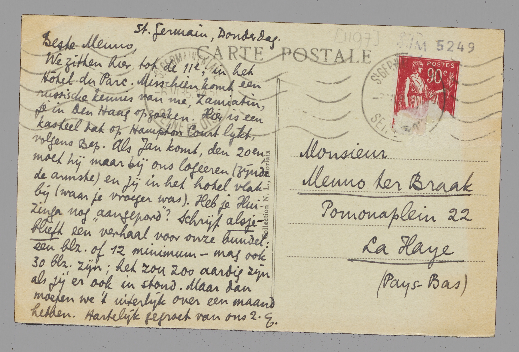 We zitten hier tot de 11e, in het Hôtel du Parc. Misschien komt een russische kennis van me, Zamiatin, je in Den Haag opzoeken. Hier is een kasteel dat op Hampton Court lijkt, volgens Bep. Als Jan komt, den 20en, moet hij maar bij ons logeeren (zijnde de armste) en jij in het hotel vlak bij (waar je vroeger was). Heb je Huizinga nog ‘aangepord’? Schrijf alsjeblieft een verhaal voor onze bundel: een blz. of 12 minimum - mag ook 30 blz. zijn; het zou zoo aardig zijn als jij er ook in stond. Maar dan moeten we 't uiterlijk over een maand hebben. Hartelijk gegroet van ons 2.