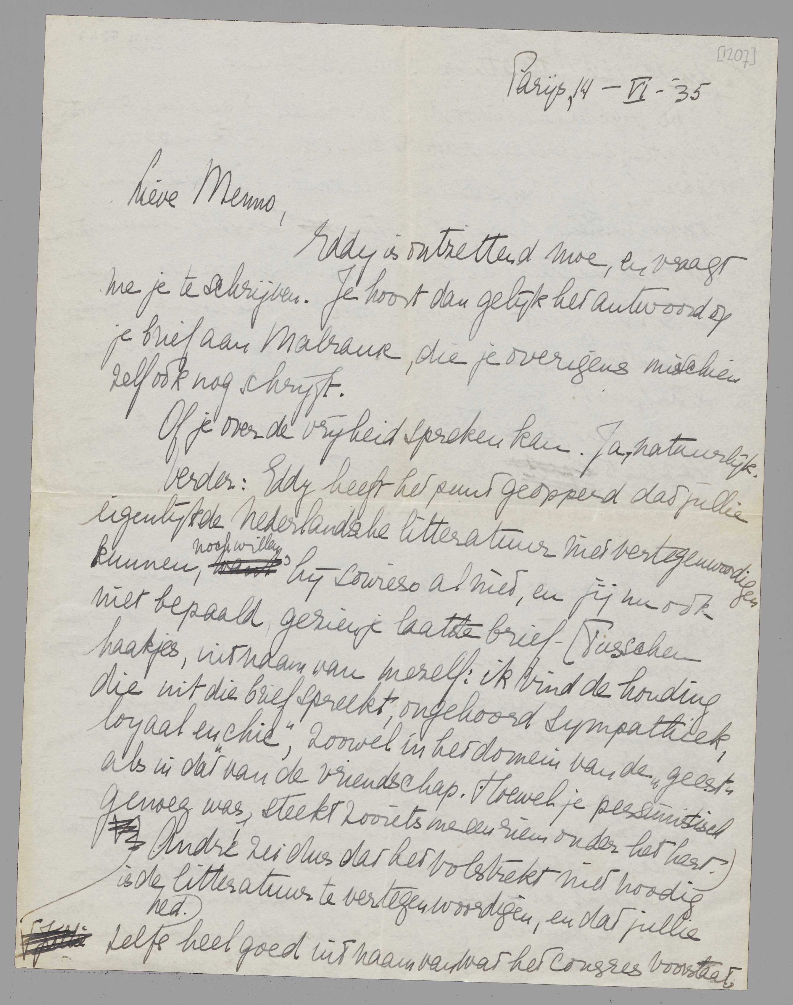 Verder: Eddy heeft het punt geopperd dat jullie eigenlijk de Nederlandsche litteratuur niet vertegenwoordigen kunnen, noch willen, hij sowieso al niet, en jij nu ook niet bepaald, gezien je laatste brief. (Tusschen haakjes, uit naam van mezelf: ik vind de houding die uit die brief spreekt, ongehoord sympathiek, loyaal en ‘chic’, zoowel in het domein van de ‘geest’ als in dat van de vriendschap. Hoewel je pessimistisch genoeg was, steekt zooiets me een riem onder het hart.)