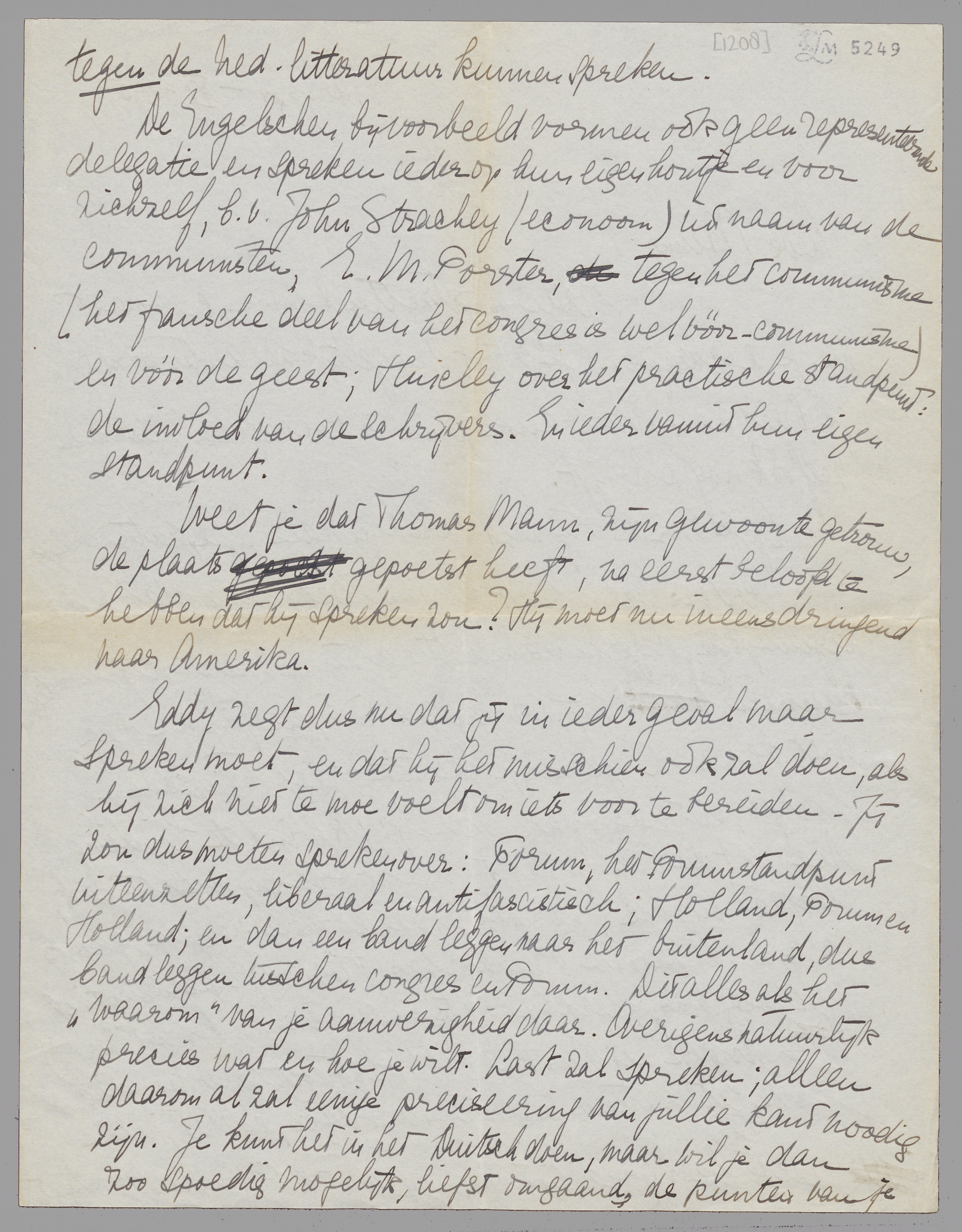 Eddy zegt dus nu dat jij in ieder geval maar spreken moet, en dat hij het misschien ook zal doen, als hij zich niet te moe voelt om iets voor te bereiden. Jij zou dus moeten spreken over: Forum, het Forumstandpunt uiteenzetten, liberaal en antifascistisch; Holland, Forum en Holland; en dan een band leggen naar het buitenland, dus band leggen tusschen congres en Forum. Dit alles als het ‘waarom’ van je aanwezigheid daar. Overigens natuurlijk precies wat en hoe je wilt. Last zal spreken; alleen daarom al zal eenige preciseering van jullie kant noodig zijn. Je kunt het in het Duitsch doen, maar wil je dan zoo spoedig mogelijk, liefst omgaand de punten van je discours opgeven, zoodat die gedrukt kunnen worden, in alle talen vertaald.