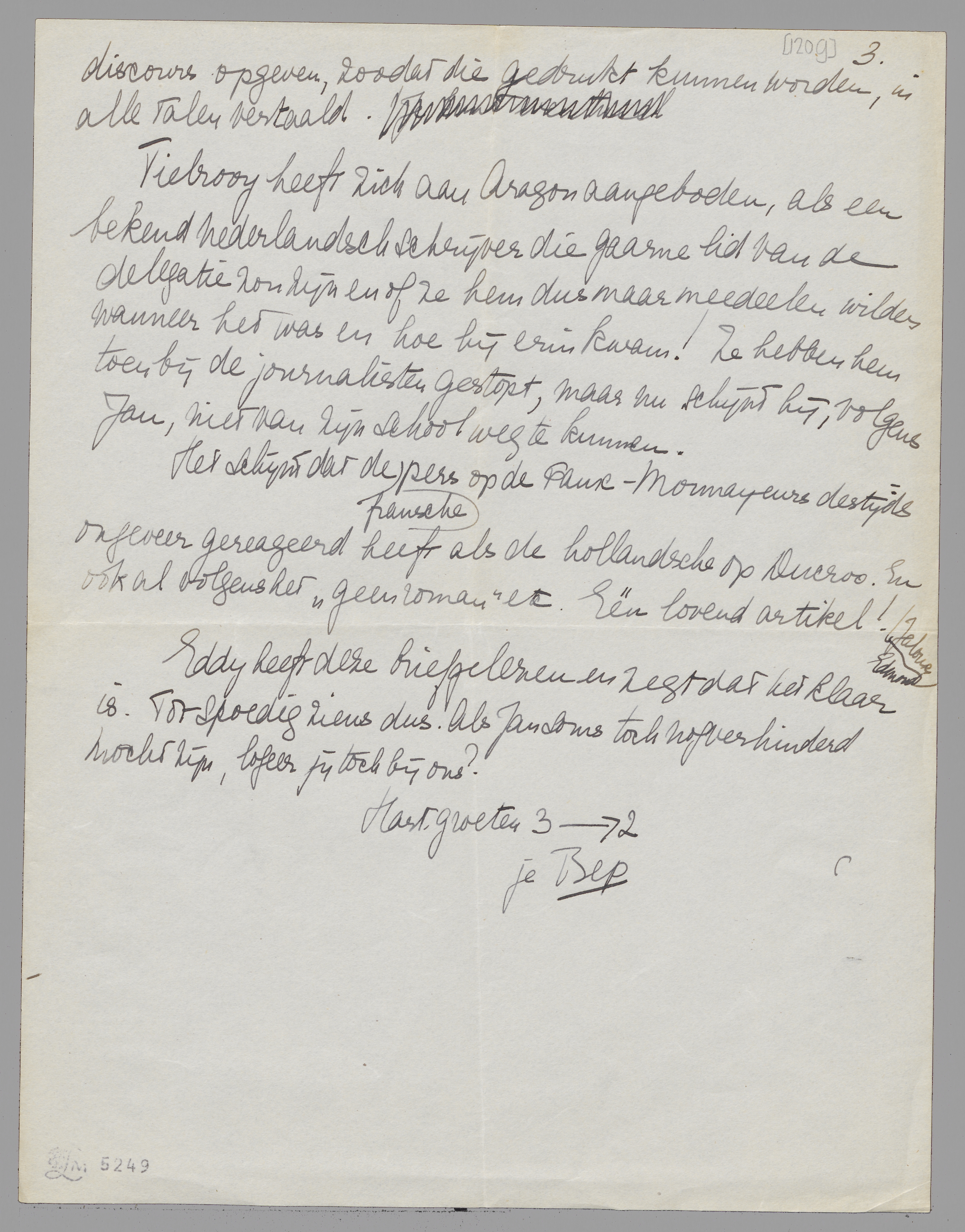 André zei dus dat het volstrekt niet noodig is de Ned. litteratuur te vertegenwoordigen, en dat jullie zelfs heel goed uit naam van wat het congres voorstaat, tegen de Ned. litteratuur kunnen spreken.