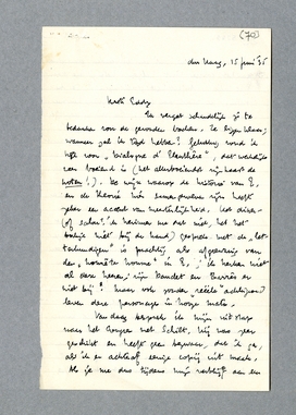 Vandaag besprak ik mijn uitstap naar het Congres met Schilt. Hij was zeer geschikt en heeft geen bezwaar, dat ik ga, als ik er achteraf eenige copij uit maak. Als je me dus tijdens mijn verblijf aan een of ander interview met een beroemden deelnemer aan het congres kunt helpen, help je me daarmee mijn ‘Aufenthaltsgenehmigung’ te betalen. We moeten dan maar eens zien, hoe we de berichtgeving verdeelen. Ik reis in den tijd van Het Vaderland, dus moet iets ‘leveren’. Aangezien ik Donderdag nog op de krant moet zijn ('s morgens), kom ik Donderdag met de Pullmann (19.28 Nord). Wil jij dan voor die dagen een kamer voor mij bestellen in het hotel?