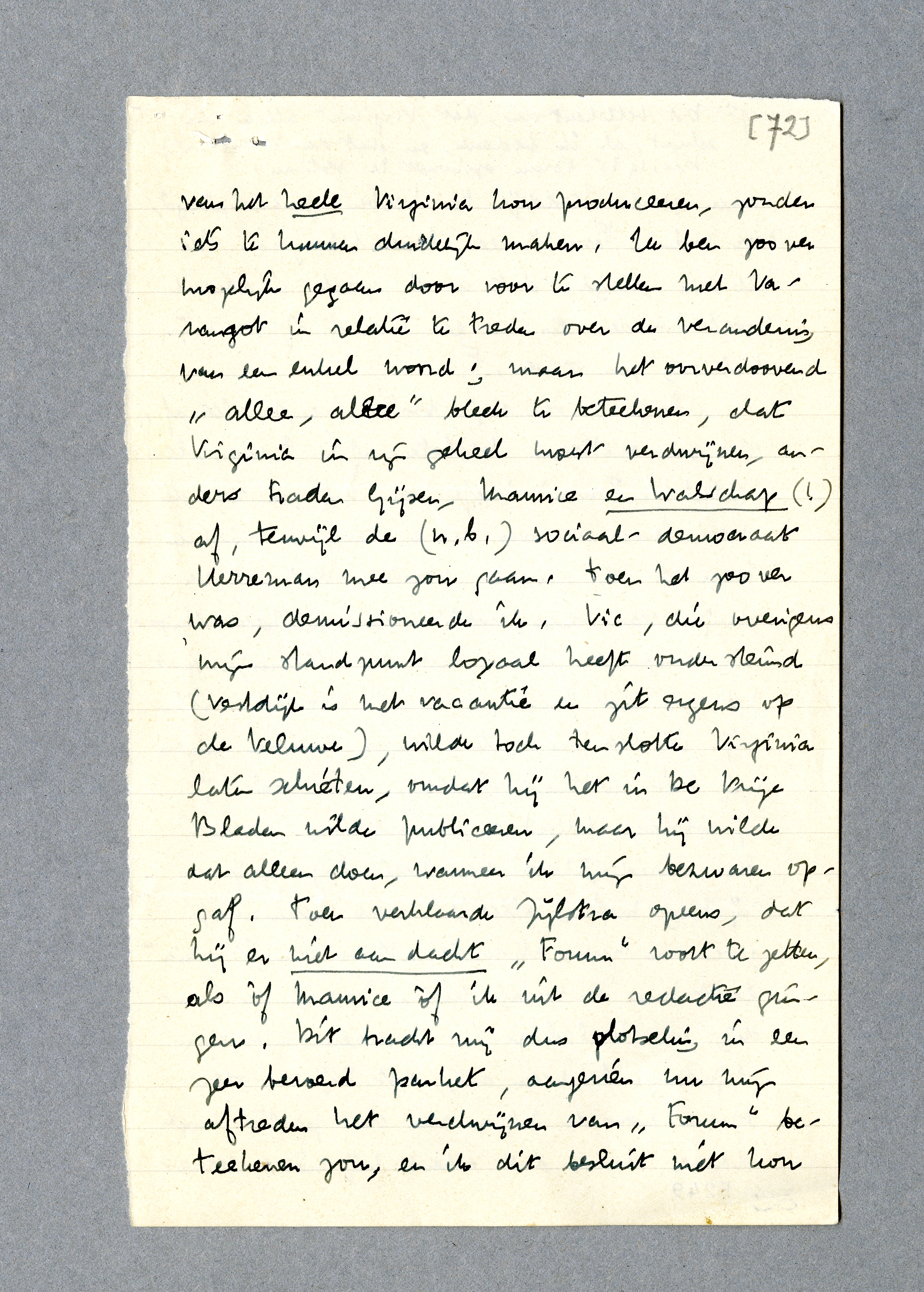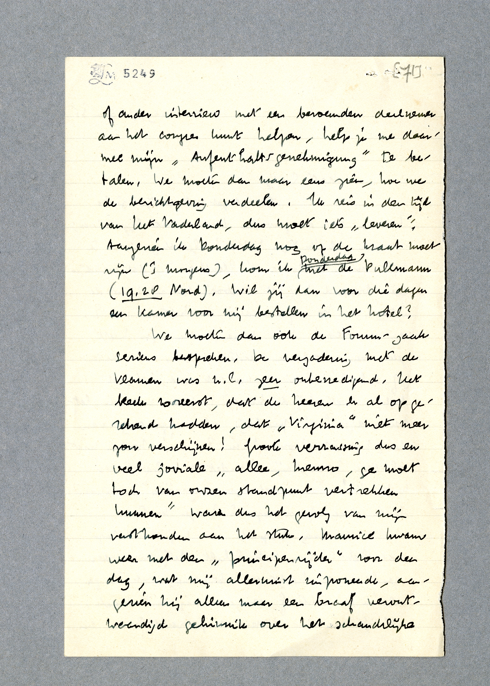 Ergo: van mijn besluit hangt alles af. Ik ben niettemin besloten af te treden. Een gelubd Forum heeft voor mij geen waarde meer. Maar daarover dus in Parijs. Misschien kan er iets gevonden worden, dat het verdwijnen van deze publicatiemogelijkheid eenigszins vergoedt. Maar met de Vlamingen gaat het zoo niet langer. Als zij Roomsch willen zijn, is dat hun zaak, maar daarmee mogen wij niets uitstaande hebben. Bovendien zijn zij volslagen idioot en karakterloos, want de ‘onzedelijkheid’ van Walschap grijnzen zij weg met ‘allee's’, en rekenschap geven van hun absurde afkeer van Virginia lukt hun eenvoudig niet. Vooral de houding van Walschap is in dezen meer dan slijmerig. Ik neem aan, dat hij om den broode naar de pijpen van den pastoor moet dansen, maar dat erkent hij niet. Herreman is tout simplement een geschikte nul.