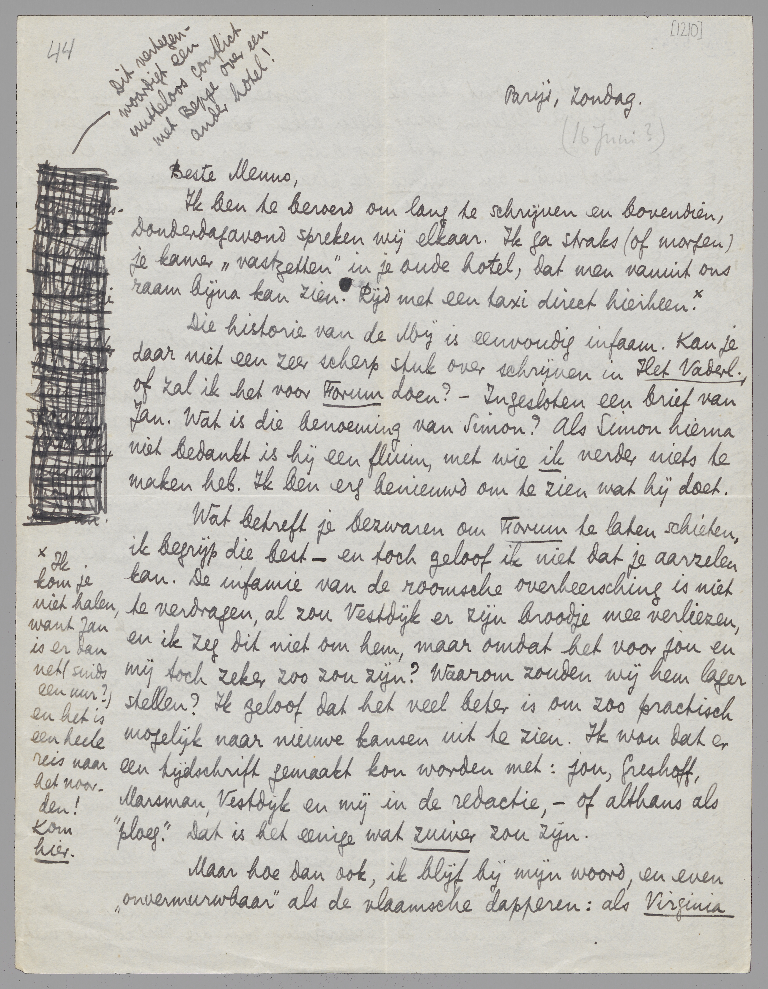 Ik ben te beroerd om lang te schrijven en bovendien, Donderdagavond spreken wij elkaar. Ik ga straks (of morgen) je kamer ‘vastzetten’ in je oude hotel, dat men vanuit ons raam bijna kan zien. Rijd met een taxi direct hierheen. [Ik kom je niet halen, want Jan is er dan net (sinds een uur?) en het is een heele reis naar het noorden! Kom hier.]