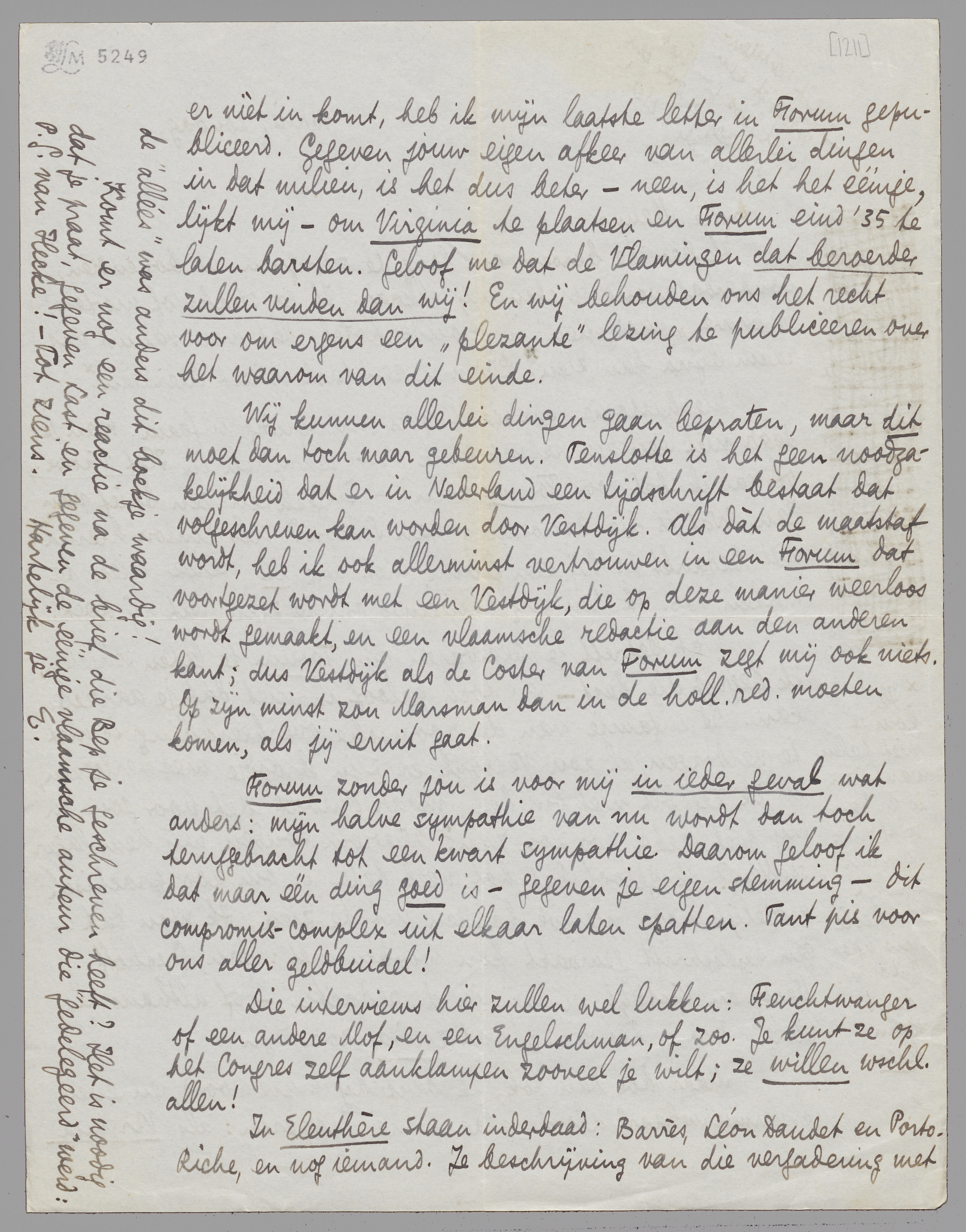 Maar hoe dan ook, ik blijf bij mijn woord, en even ‘onvermurwbaar’ als de vlaamsche dapperen: als Virginia er nièt in komt, heb ik mijn laatste letter in Forum gepubliceerd. Gegeven jouw eigen afkeer van allerlei dingen in dat milieu, is het dus beter - neen, is het het éénige, lijkt mij - om Virginia te plaatsen en Forum eind '35 te laten barsten. Geloof me dat de Vlamingen dat beroerder zullen vinden dan wij! En wij behouden ons het recht voor om ergens een ‘plezante’ lezing te publiceeren over het waarom van dit einde.