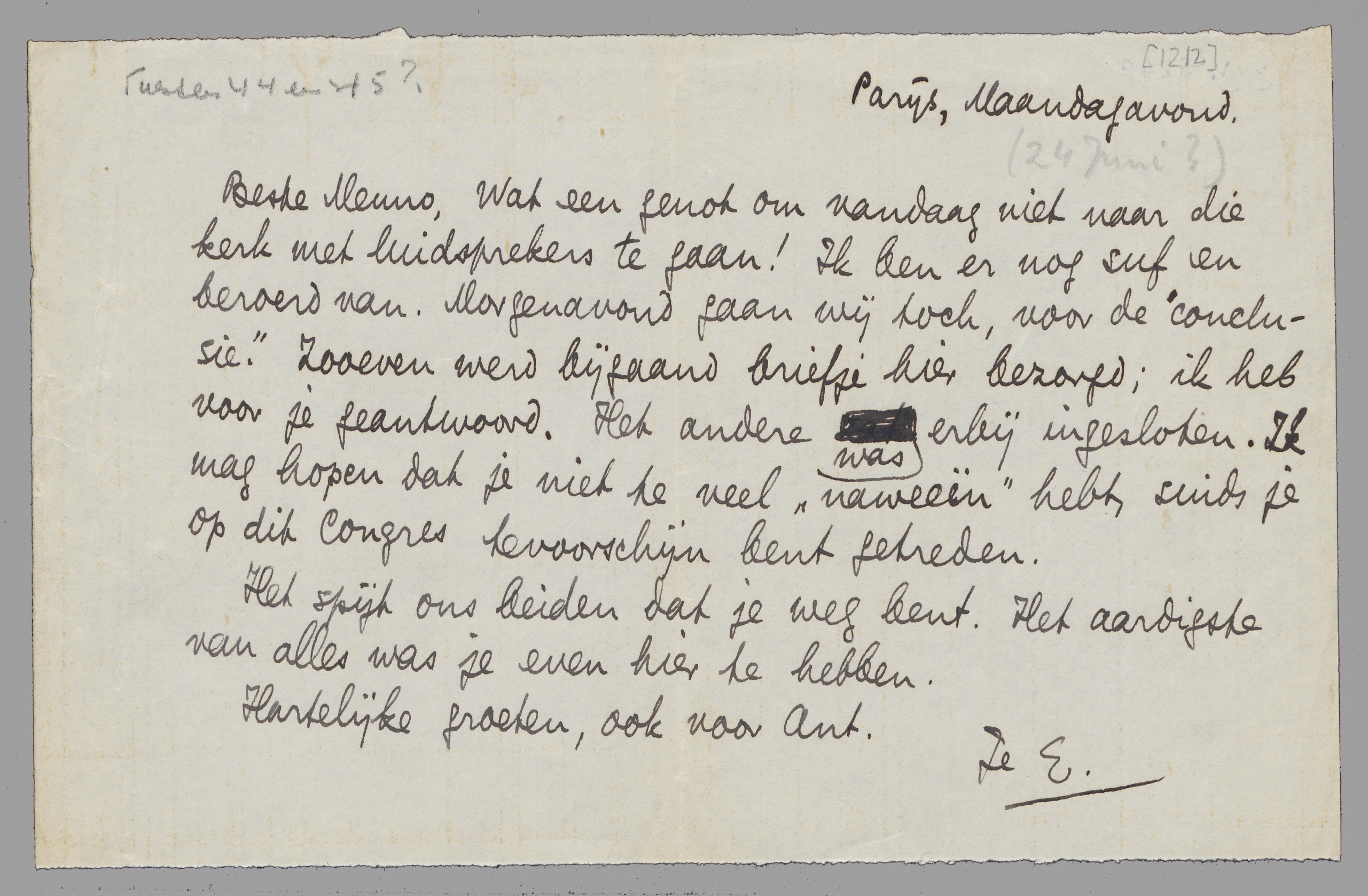 Wat een genot om vandaag niet naar die kerk met luidsprekers te gaan! Ik ben er nog suf en beroerd van. Morgenavond gaan wij toch, voor de ‘conclusie’. Zooeven werd bijgaand briefje hier bezorgd; ik heb voor je geantwoord. Het andere was erbij ingesloten. Ik mag hopen dat je niet te veel ‘naweeën’ hebt, sinds je op dit Congres tevoorschijn bent getreden.