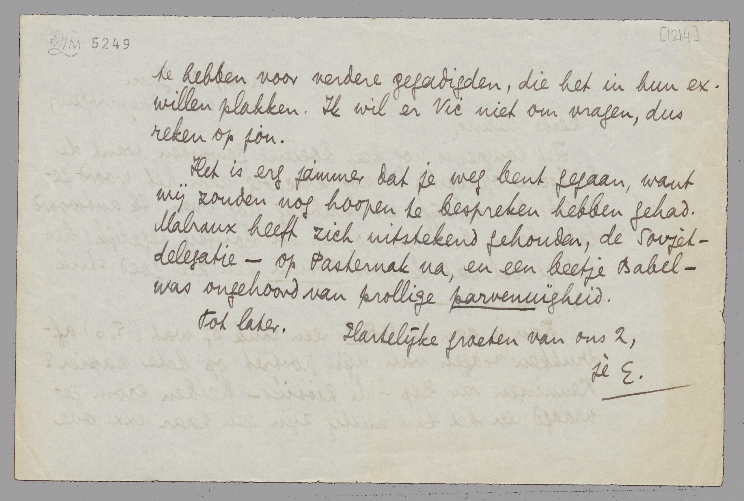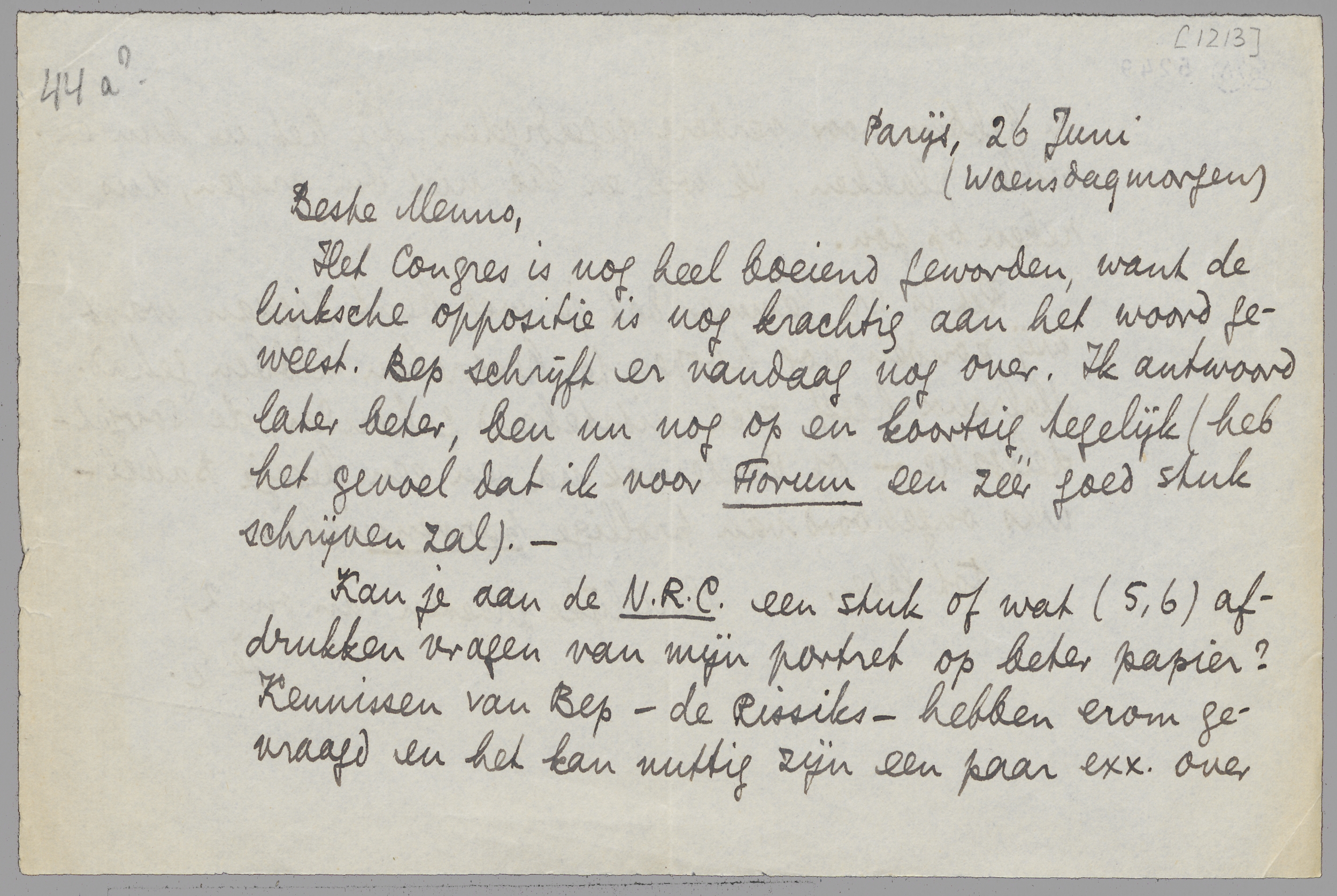 Kan je aan de N.R.C. een stuk of wat (5, 6) afdrukken vragen van mijn portret op beter papier? Kennissen van Bep - de Rissiks - hebben erom gevraagd en het kan nuttig zijn een paar exx. over te hebben voor verdere gegadigden, die het in hun ex. willen plakken. Ik wil er Vic niet om vragen, dus reken op jou. Het is erg jammer dat je weg bent gegaan, want wij zouden nog hoopen te bespreken hebben gehad. Malraux heeft zich uitstekend gehouden, de Sovjet-delegatie - op Pasternak na, en een beetje Babel - was ongehoord van prollige parvenuïgheid.